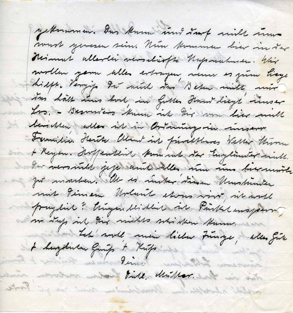 gekommen. Das kann und darf nicht umsonst gewesen sein. Nun kommen hier in der Heimat allerlei verschärfte Maßnahmen. Wir wollen gern alles ertragen, wenn es zum Siege hilft. Vergiß Du auch das Beten nicht, nur das hält uns hoch, in Gottes Hand liegt unser Los. – Besonders kann ich Dir von hier nicht berichten, alles ist in Ordnung in unserer Familie. Heute Abend ist furchtbares Wetter, Sturm + Regen. Hoffentlich kommt der Engländer nicht. Der versucht jetzt auch alles, um uns hier mürbe zu machen. Ob es unter diesen Umständen mit Deinem Urlaub etwas wird, ist wohl fraglich? Augenblicklich ist Päckchensperre, so daß ich Dir nicht schicken kann.