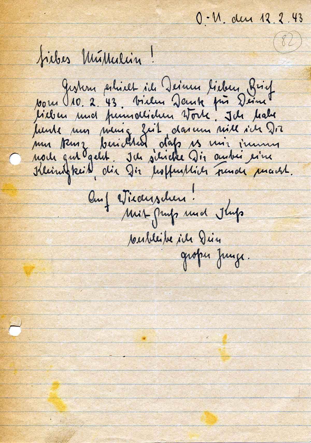 Gestern erhielt ich Deinen lieben Brief vom 10.2.43. Vielen Dank für Deine lieben und freundlichen Worte. Ich habe heute nur wenig Zeit, darum will ich Dir nur kurz berichten, daß es mir immer noch gut geht. Ich schicke Dir anbei eine Kleinigkeit, die Dir hoffentlich Freude macht.