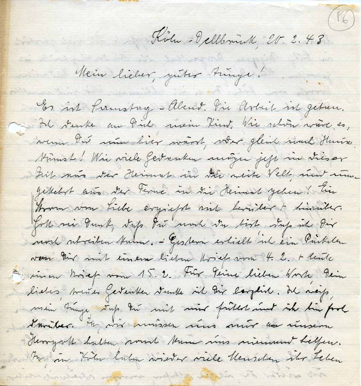 Es ist Samstag-Abend. Die Arbeit ist getan. Ich denke an Dich, mein Kind. Wie schön wäre es, wenn Du nun hier wärst, oder gleich nach Hause kämst! Wie viele Gedanken mögen jetzt in dieser Zeit aus der Heimat in die weite Welt, und umgekehrt aus der Ferne in die Heimat gehen! Ein Strom von Liebe ergießt sich herüber + hinüber. Gott sei Dank, daß Du noch da bist, daß ich Dir noch schreiben kann. – Gestern erhielt ich ein Päckchen von Dir mit einem lieben Brief vom 4.2. + heute einen Brief vom 15.2. Für Deine lieben Worte, Dein liebes, treues Gedenken danke ich Dir herzlich. Ich weiß, mein Junge, daß Du mit mir fühlst und ich bin froh darüber. Ja, wir müssen uns nur an unsern Herrgott halten, sonst kann uns niemand helfen. Ja, in Köln haben wieder viele Menschen ihr Leben