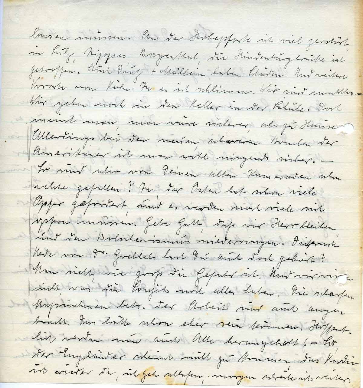 lassen müssen. An der Hohepforte ist viel zerstört, in Sülz, Nippes, Bayenthal, die Hindenburgbrücke ist getroffen. Auch Deutz + Mülheim haben Schäden. Und weitere Vororte von Köln. Ja es ist schlimm. Wir sind machtlos . – Wir gehen noch in den Keller in der Schule. Dort meint man, man wäre sicherer, als zu Hause. Allerdings bei den neuen, schweren Bomben der Amerikaner ist man wohl nirgends sicher. – So sind also von Deinen alten Kameraden schon welche gefallen? Ja, der Osten hat schon viele Opfer gefordert, und es werden noch viele sich opfern müssen. Gebe Gott, daß wir Herr bleiben und den Bolschewismus niederringen. Die neuste Rede von Dr. Goebbels hast Du auch doch gehört? Man sieht, wie groß die Gefahr ist. Und wir wissen nicht, was die Sowjets noch alles haben. Die scharfen Maßnahmen betr. der Arbeit sind auch angebracht. Das hätte schon eher sein können. Hoffentlich werden nun auch Alle herangeholt! – So, der Engländer scheint nicht zu kommen, das Radio ist wieder da, ich geh schlafen, morgen schreibe ich weiter.