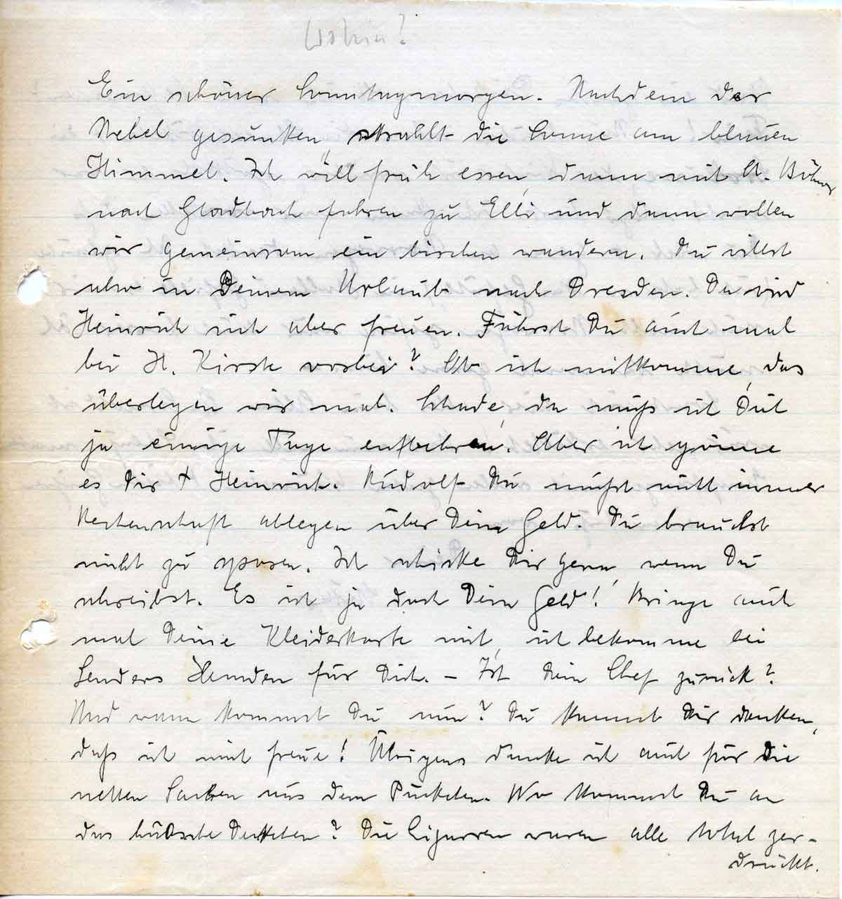 Ein schöner Sonntagmorgen. Nachdem der Nebel gesunken, strahlt die Sonne am blauen Himmel. Ich will früh essen, dann mit A. Böhner nach Gladbach fahren zu Elli und dann wollen wir gemeinsam ein bischen wandern. Du willst also in Deinem Urlaub nach Dresden. Da wird Heinrich sich aber freuen. Fährst Du auch mal bei H. Kirste vorbei? Ob ich mitkomme, das überlegen wir mal. Schade, da muß ich Dich ja einige Tage entbehren. Aber ich gönne es Dir + Heinrich. Rudolf Du mußt nicht immer Rechenschaft ablegen über Dein Geld. Du brauchst nicht zu sparen. Ich schicke Dir gern, wenn Du schreibst. Es ist ja doch Dein Geld! Bringe auch mal Deine Kleiderkarte mit, ich bekomme bei Lenders Hemden für Dich. – Ist Dein Chef zurück? Und wann kommst Du nun? Du kannst Dir denken, daß ich mich freue! Übrigens danke ich auch für die netten Sachen aus dem Päckchen. Wo kommst Du an das hübsche Deckchen? Die Cigarren waren alle total zerdrückt.