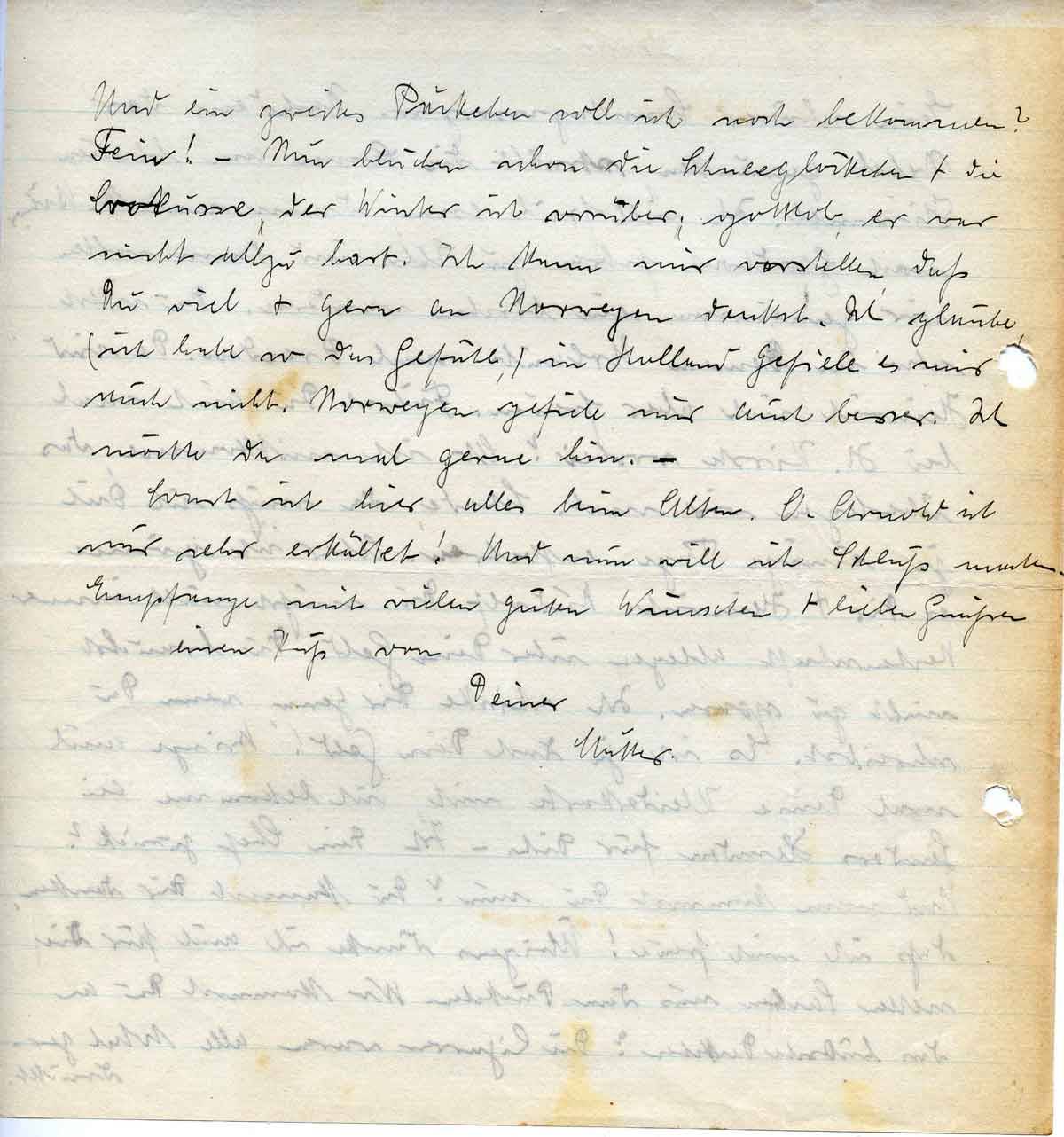 Und ein zweites Päckchen soll ich noch bekommen? Fein! – Nun blühen schon die Schneeglöckchen + die Crokusse, der Winter ist vorüber; gottlob, er war nicht allzu hart. Ich kann mir vorstellen, daß Du viel + gern an Norwegen denkst. Ich glaube, (ich habe so das Gefühl,) in Holland gefiele es mir auch nicht. Norwegen gefiele mir auch besser. Ich möchte da mal gerne hin. –
