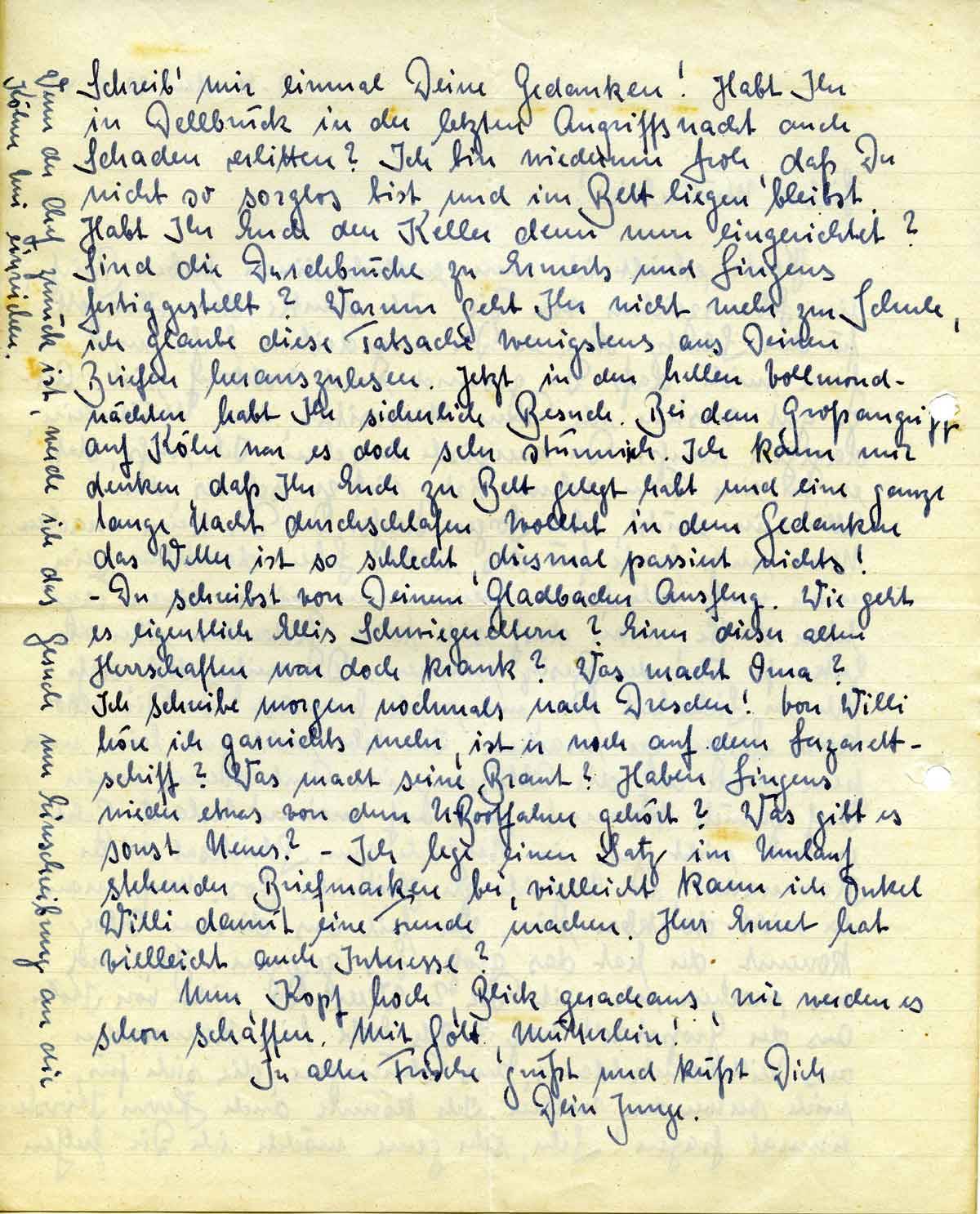 Schreib‘ mir einmal Deinen Gedanken! Habt Ihr in Dellbrück in der letzten Angriffsnacht auch Schaden erlitten? Ich bin wiederum froh, daß Du nicht so sorglos bist und im Bett liegen bleibst. Habt Ihr Euch den Keller denn nun eingerichtet? Sind die Durchbrüche zu Ermerts und Lingens fertiggestellt? Warum geht Ihr nicht mehr zur Schule, ich glaube diese Tatsache wenigstens aus Deinen Briefen herauszulesen. Jetzt in den hellen Vollmondnächten habt Ihr sicherlich Besuch. Bei dem Großangriff auf Köln war es doch sehr stürmisch. Ich kann mir denken, daß Ihr Euch zu Bett gelegt habt und eine ganze lange Nacht durchschlafen wolltet in dem Gedanken das Wetter ist so schlecht, diesmal passiert nichts! – Du schreibst von Deinem Gladbacher Ausflug. Wie geht es eigentlich Ellis Schwiegereltern? Einer dieser alten Herrschaften war doch krank? Was macht Oma? Ich schreibe morgen nochmals nach Dresden! Von Willi höre ich garnichts mehr, ist er noch auf dem Lazarettschiff? Was macht seine Braut? Haben Lingens wieder etwas von dem U-Bootfahrer gehört? Was gibt es sonst Neues? – Ich lege einen Satz im Umlauf stehender Briefmarken bei, vielleicht kann ich Onkel Willi damit eine Freude machen. Herr Ermert hat vielleicht auch Interesse?