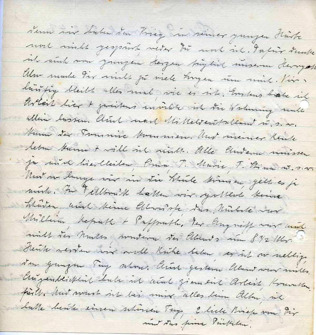 denn wir haben den Krieg in seiner ganzen Härte noch nicht gespürt, weder Du noch ich. Dafür danke ich auch von ganzem Herzen täglich unserm Herrgott. Also mache Dir nicht zu viele Sorgen um mich. Vorläufig bleibt alles mal, wie es ist. Erstens habe ich Arbeit hier + zweitens möchte ich die Wohnung nicht allein lassen. Auch nach Mitteldeutschland u.s.w. kann der Tommie kommen. Und meiner Rente leben kann + will ich nicht. Alle Andern müssen ja auch hierbleiben, Oma, T. Marie, T. Stina u.s.w. Und so lange wir in die Schule können, geht es ja auch. In Dellbrück hatten wir gottlob keine Schäden, auch keine Abwürfe, das Nächste war Mülheim, Refrath + Paffrath. Der Angriff war auch nichts des Nachts, sondern des Abends um 8 ½ Uhr. Heute werden wir wohl Ruhe haben, es ist so neblig, den ganzen Tag schon. Auch gestern Abend war nichts. Augenblicklich habe ich auch ziemlich Arbeit, Krawatten für A. Und sonst ist bei mir alles beim Alten, ich hatte heute einen schönen Tag, 2 liebe Briefe von Dir und das feine Päckchen.