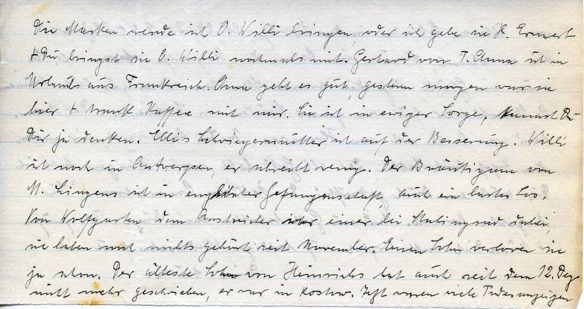 die Marken werde ich O. Willi bringen, oder ich gebe sie H. Ermert + Du bringst sie O. Willi nochmals mit. Gerhard von T. Anna ist in Urlaub aus Frankreich. Oma geht es gut, gestern morgen war sie hier + trank Kaffee mit mir. Sie ist in ewiger Sorge, kannst Du Dir ja denken. Ellis Schwiegermutter ist auf der Besserung. Willi ist noch in Antwerpen, er schreibt wenig. Der Bräutigam von M. Lingens ist in englischer Gefangenschaft, auch ein hartes Los. Von Wolfgarten, dem Anstreicher war einer bei Stalingrad dabei, sie haben noch nichts gehört seit November. Einen Sohn verloren sie ja schon. Der älteste Sohn von Heinrichs hat auch seit dem 12. Dez. nicht mehr geschrieben, er war in Rostow. Jetzt waren viele Todesanzeigen