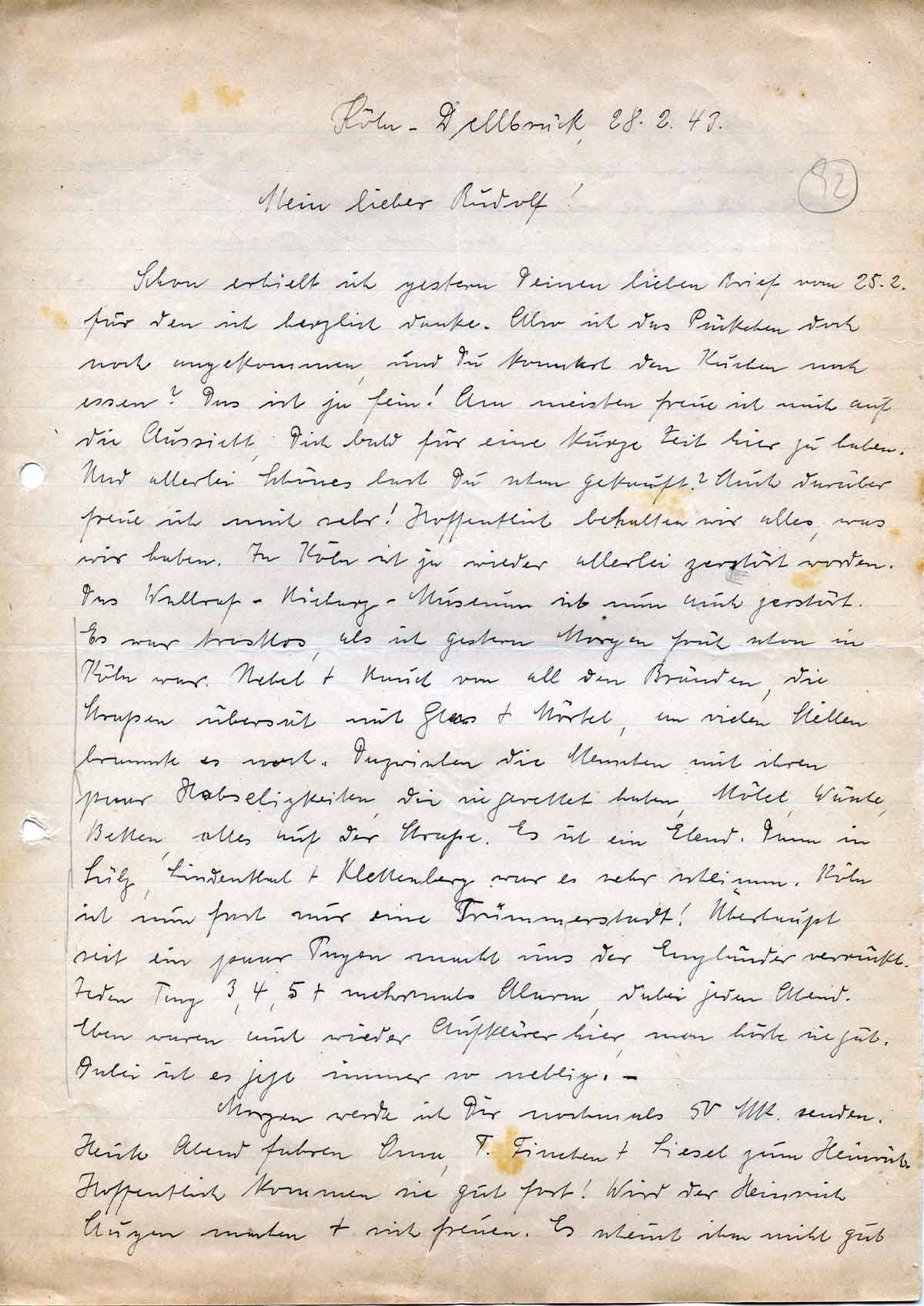 Schon erhielt ich gestern Deinen lieben Brief vom 25.2. für den ich herzlich danke. Also ist das Päckchen doch noch angekommen, und Du konntest den Kuchen noch essen? Das ist ja fein! Am meisten freue ich mich auf die Aussicht, Dich bald für eine kurze Zeit hier zu haben. Und allerlei Schönes hast Du schon gekauft? Auch darüber freue ich mich sehr! Hoffentlich behalten wir alles, was wir haben. In Köln ist ja wieder allerlei zerstört worden. Das Wallraf-Richarz-Museum ist nun auch zerstört. Es war trostlos, als ich gestern Morgen früh schon in Köln war. Nebel + Rauch von all den Bränden, die Straßen übersät mit Glas + Möbel, an vielen Stellen brannte es noch. Dazwischen die Menschen mit ihren paar Habseligkeiten, die sie gerettet haben, Möbel, Wäsche, Betten, alles auf der Straße. Es ist ein Elend. Dann in Sülz, Lindenthal + Klettenberg war es sehr schlimm. Köln ist nun fast nur eine Trümmerstadt! Überhaupt seit ein paar Tagen macht uns der Engländer verrückt. Jeden Tag 3, 4, 5 + mehrmals Alarm, dabei jeden Abend. Eben waren auch wieder Aufklärer hier, man hörte sie gut. Dabei ist es jetzt immer so neblig. –