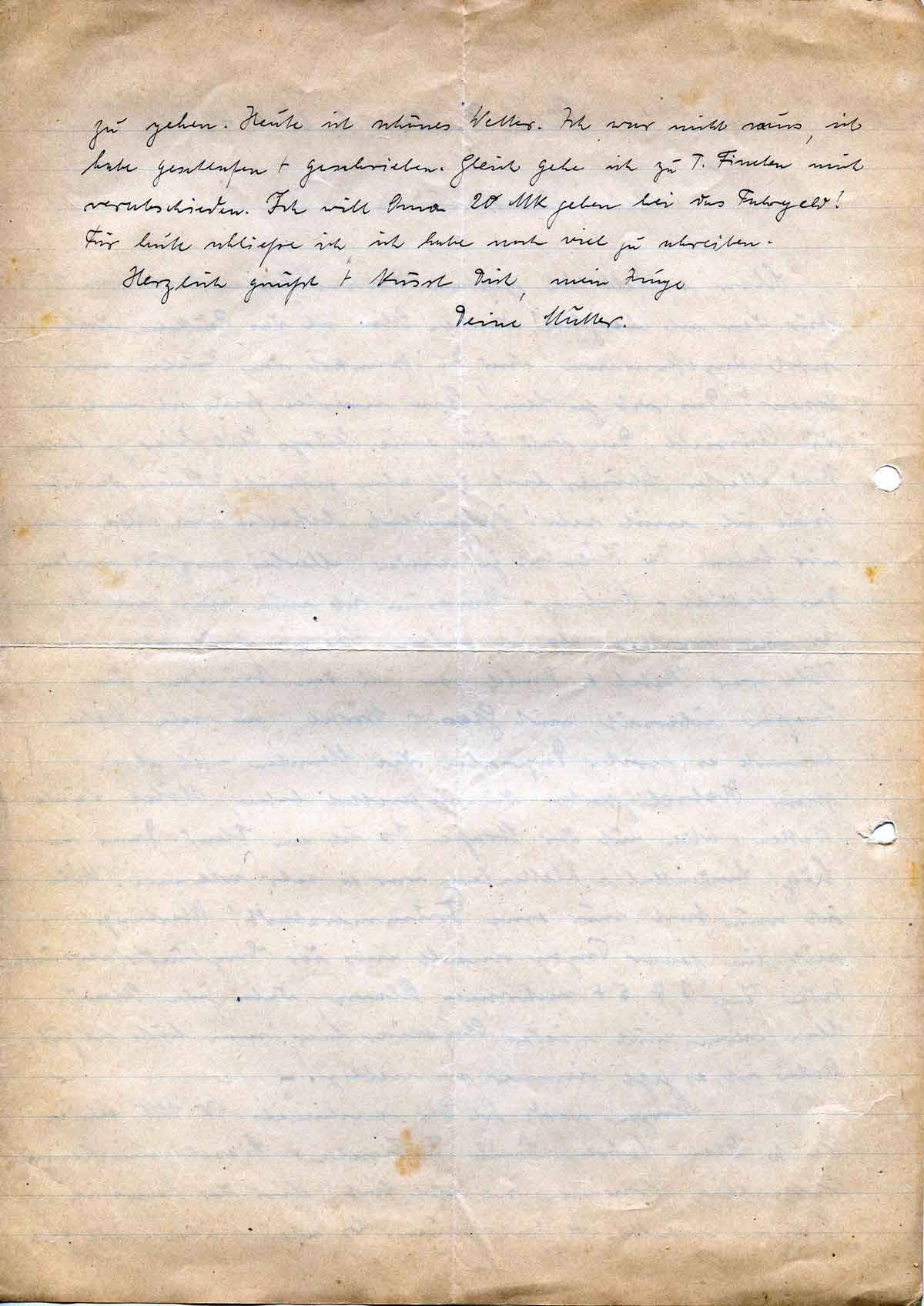 Morgen werde ich Dir nochmals 50 Mk. senden. Heute Abend fahren Oma, T. Finchen + Liesel zum Heinrich. Hoffentlich kommen sie gut fort! Wird der Heinrich Augen machen + sich freuen. Es scheint ihm nicht gut