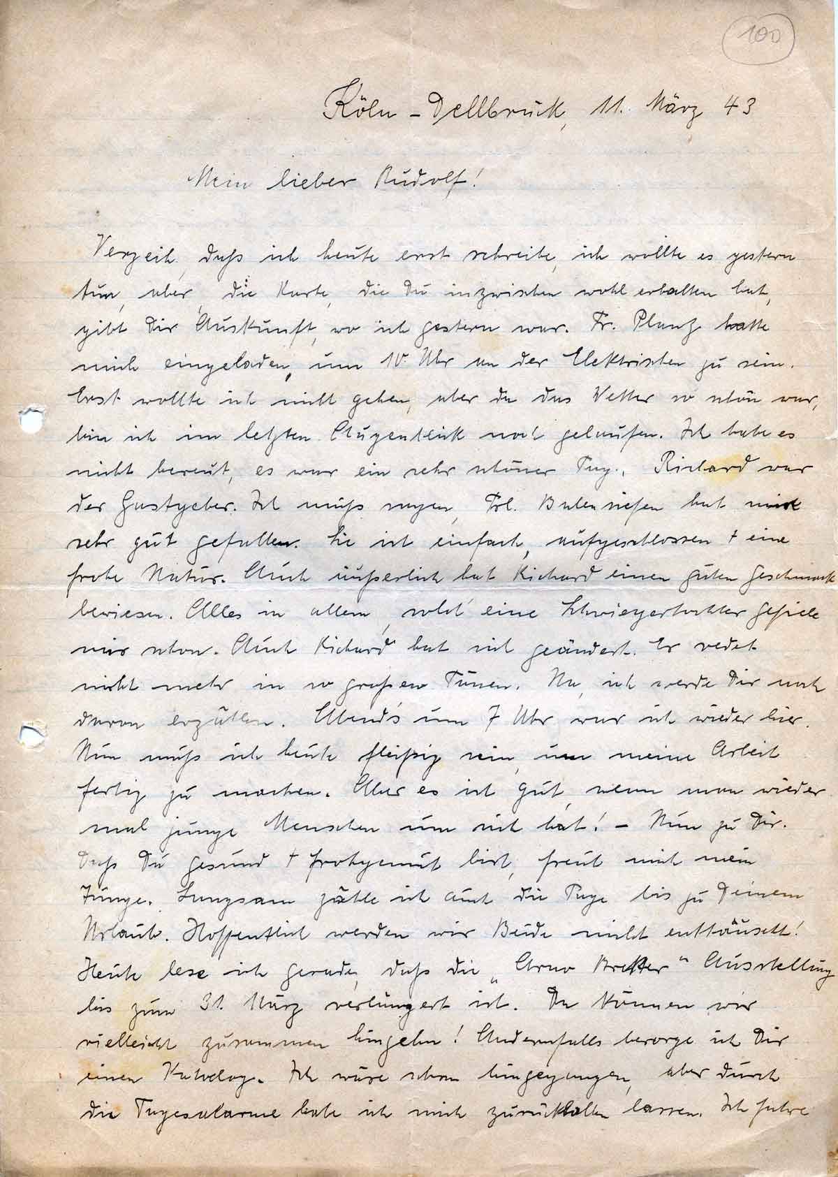 Verzeih, daß ich heute erst schreibe, ich wollte es gestern tun, aber, die Karte, die Du inzwischen wohl erhalten hast, gibt Dir Auskunft, wo ich gestern war. Fr. Plantz hatte mich eingeladen, um 10 Uhr an der Elektrischen zu sein. Erst wollte ich nicht gehen, aber da das Wetter so schön war, bin ich im letzten Augenblick noch gelaufen. Ich habe es nicht bereut, es war ein sehr schöner Tag. Richard war der Gastgeber. Ich muß sagen, Frl. Balensiefen hat mir sehr gut gefallen. Sie ist einfach, aufgeschlossen + eine frohe Natur. Auch äußerlich hat Richard einen guten Geschmack bewiesen. Alles in allem, solch‘ eine Schwiegertochter gefiele mir schon. Auch Richard hat sich geändert. Er redet nicht mehr in so großen Tönen. Na, ich werde Dir noch davon erzählen. Abend’s um 7 Uhr war ich wieder hier. Nun muß ich heute fleißig sein, um meine Arbeit fertig zu machen. Aber es ist gut, wenn man wieder mal junge Menschen um sich hat! – Nun zu Dir. Daß Du gesund + frohgemut bist, freut mich mein Junge. Langsam zähle ich auch die Tage bis zu Deinem Urlaub. Hoffentlich werden wir Beide nicht enttäuscht! Heute lese ich gerade, daß die „Arno Breker“ Ausstellung bis zum 31. März verlängert ist. Da können wir vielleicht zusammen hingehn! Andernfalls besorge ich Dir einen Katalog. Ich wäre schon hingegangen, aber durch die Tagesalarme habe ich mich zurückhalten lassen. Ich fahre