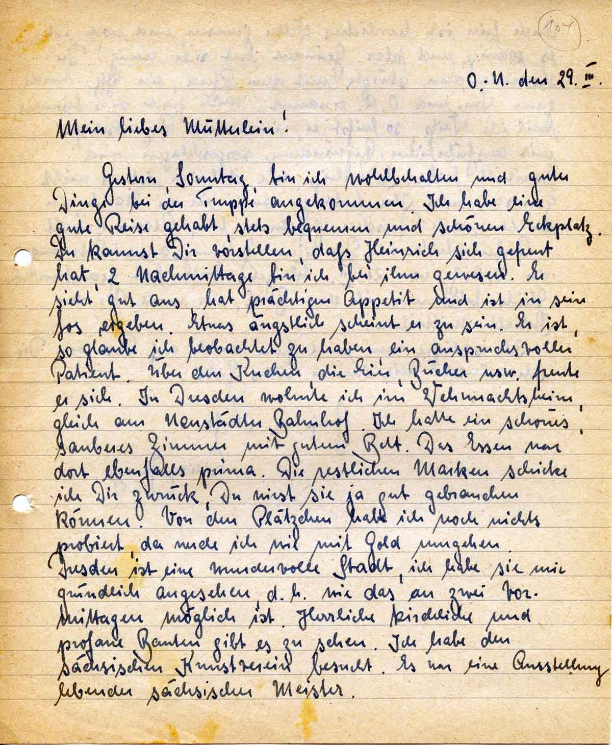 Gestern, Sonntag, bin ich wohlbehalten und guter Dinge bei der Truppe angekommen. Ich habe eine gute Reise gehabt, stets bequemen und schönen Eckplatz. Du kannst Dir vorstellen, daß Heinrich sich gefreut hat, 2 Nachmittage bin ich bei ihm gewesen. Er sieht gut aus, hat prächtigen Appetit und ist in sein Los ergeben. Etwas ängstlich scheint er zu sein. Er ist, so glaube ich beobachtet zu haben, ein anspruchsvoller Patient. Über den Kuchen, die Eier, Bücher usw. freute er sich. In Dresden wohnte ich im Wehrmachtsheim, gleich am Neustädter Bahnhof. Ich hatte ein schönes, sauberes Zimmer mit gutem Bett. Das Essen war dort ebenfalls prima. Die restlichen Marken schicke ich Dir zurück, Du wirst sie ja gut gebrauchen können. Von den Plätzchen habe ich noch nichts probiert, da werde ich wie mit Gold umgehen.