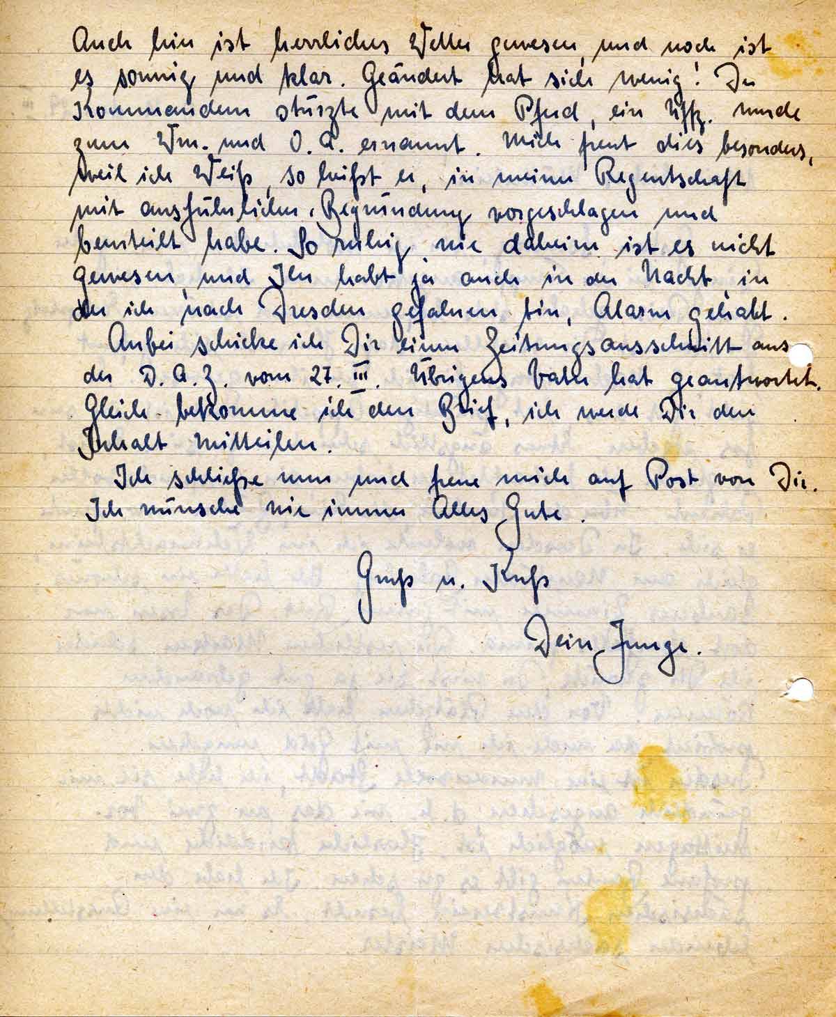Auch hier ist herrliches Wetter gewesen, und noch ist es sonnig und klar. Geändert hat sich wenig! Der Kommandeur stürzte mit dem Pferd, ein Uffz. wurde zum Wm. und O.A. ernannt. Mich freut dies besonders, weil ich Weiß, so heißt er, in meiner Regentschaft mit ausführlicher Begründung vorgeschlagen und beurteilt habe. So ruhig. wie daheim ist es nicht gewesen, und Ihr habt ja auch in der Nacht, in der ich nach Dresden gefahren bin, Alarm gehabt.