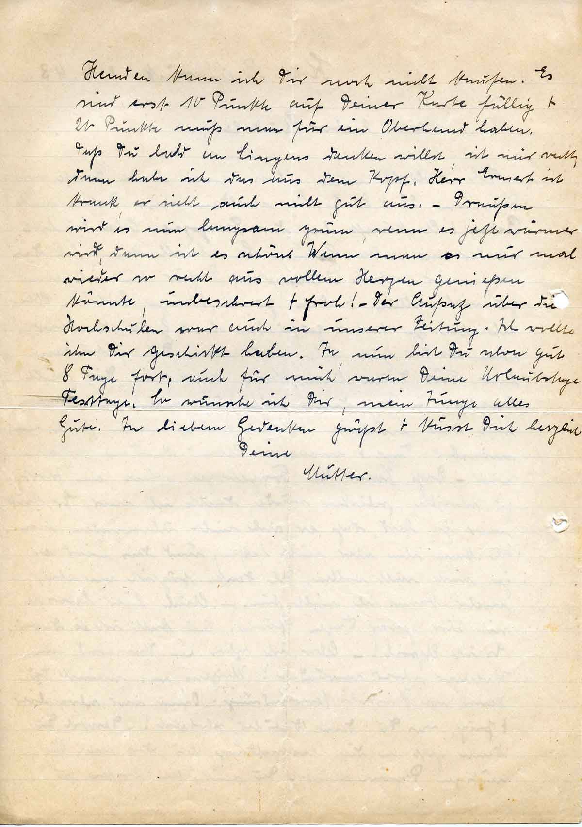 Hemden kann ich Dir noch nicht kaufen. Es sind erst 10 Punkte auf Deiner Karte fällig + 20 Punkte muß man für ein Oberhemd haben. Daß Du bald an Lingens denken willst, ist mir recht, dann habe ich das aus dem Kopf. Herr Ermert ist krank, er sieht auch nicht gut aus. – Draußen wird es nun langsam grün, wenn es jetzt wärmer wird, dann ist es schön. Wenn man es nur mal wieder so recht aus vollem Herzen genießen könnte, unbeschwert + froh! – Der Aufsatz über die Hochschulen war auch in unserer Zeitung. Ich wollte ihn Dir geschickt haben. Ja, nun bist Du schon gut 8 Tage fort, auch für mich waren Deine Urlaubstage Festtage. So wünsche ich Dir, mein Junge alles Gute. In liebem Gedenken grüßt + küsst Dich herzlich