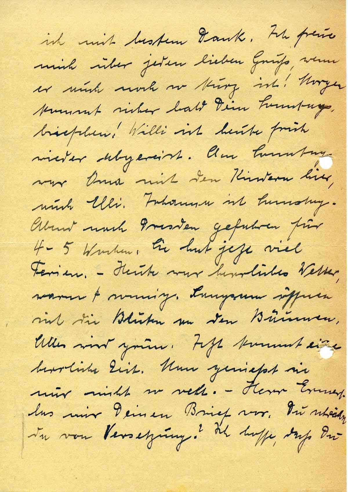 ich mit bestem Dank. Ich freue mich über jeden lieben Gruß, wenn er auch noch so kurz ist! Morgen kommt sicher bald Dein Sonntagsbriefchen! Willi ist heute früh wieder abgereist. Am Sonntag war Oma mit den Kindern hier, auch Elli. Johanna ist Samstag-Abend nach Dresden gefahren für 4-5 Wochen. Sie hat jetzt viel Ferien. – Heute war herrliches Wetter, warm + sonnig. Langsam öffnen sich die Blüten an den Bäumen. Alles wird grün. Jetzt kommt eine herrliche Zeit. Man genießt sie nur nicht so recht. – Herr Ermert las mir Deinen Brief vor. Du schriebst da von Versetzung? Ich hoffe, daß Du