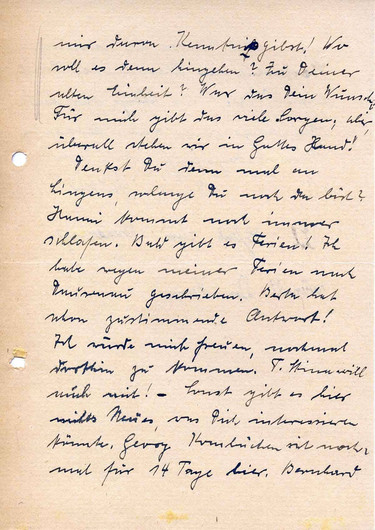 Ich würde mich freuen, nochmal dorthin zu kommen. T. Stina will auch mit! – Sonst gibt es hier nichts Neues, was Dich interessieren könnte. Georg Kombüchen ist nochmal für 14 Tage hier. Bernhard