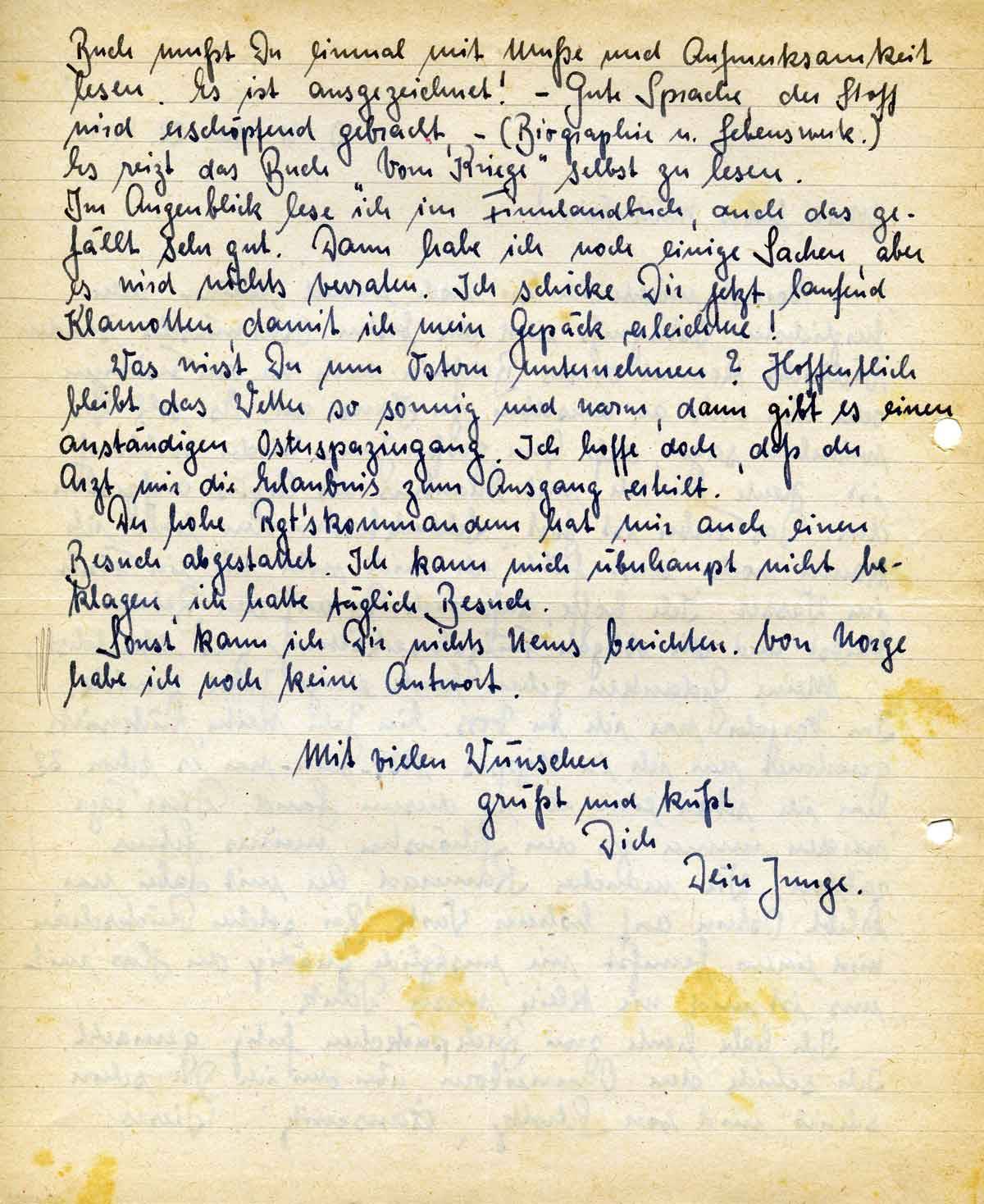 Vorerst möchte ich Dir noch einmal meinen allerherzlichsten Ostergruß und die besten Ostergrüße senden. Vielleicht kommt dieses Brieflein noch vor den Festtagen oder aber doch an denselben zu Hause an. Es soll Dir weiterhin sagen, daß Dein großer Junge wieder wohlauf ist. Heute bin ich mit Erlaubnis des Arztes aufgestanden. Das Fieber ist fort, Schluckbeschwerden habe ich kaum noch, sonst fühle ich mich wohl wie ein Fisch im Wasser. Ich hoffe, daß auch Du auf den Beinen bleibst und die obligate Frühjahrserkältung gut überstehst.