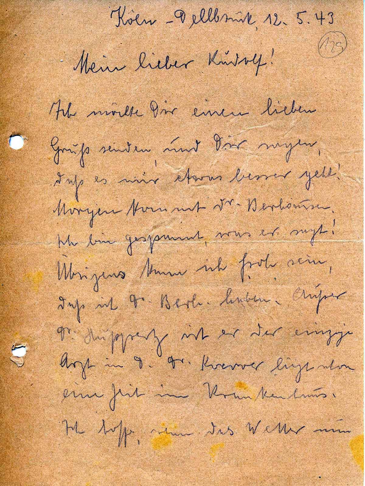 Ich möchte Dir einen lieben Gruß senden, und Dir sagen, daß es mir etwas besser geht! Morgen kommt Dr. Berhausen. Ich bin gespannt, was er sagt! Übrigens kann ich froh sein, daß ich Dr. Berh. habe. Außer Dr. Huppertz ist er der einzige Arzt in D. Dr. Koerver liegt schon eine Zeit im Krankenhaus.