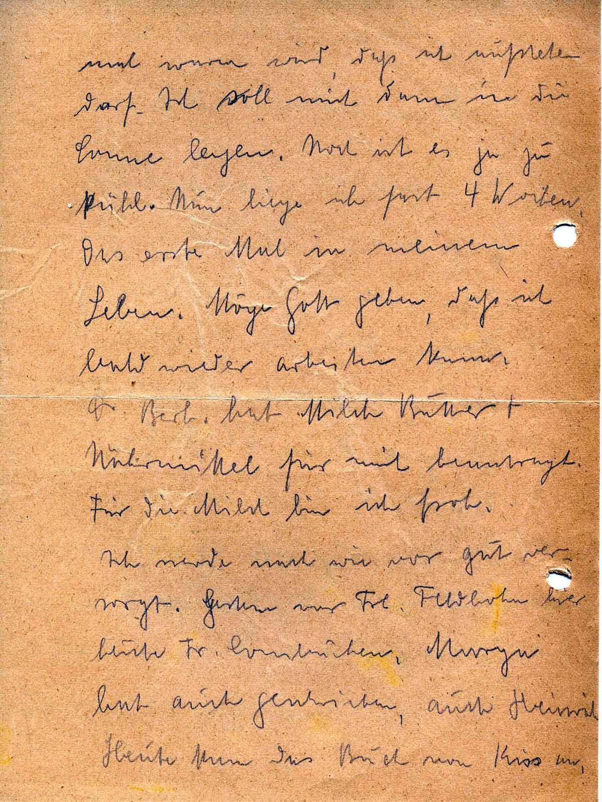 mal warm wird, daß ich aufstehen darf. Ich soll mich dann in die Sonne legen. Noch ist es ja zu kühl. Nun liege ich fast 4 Wochen. Das erste Mal in meinem Leben. Möge Gott geben, daß ich bald wieder arbeiten kann. Dr. Berh. hat Milch Butter + Nährmittel für mich beantragt. Für die Milch bin ich froh.