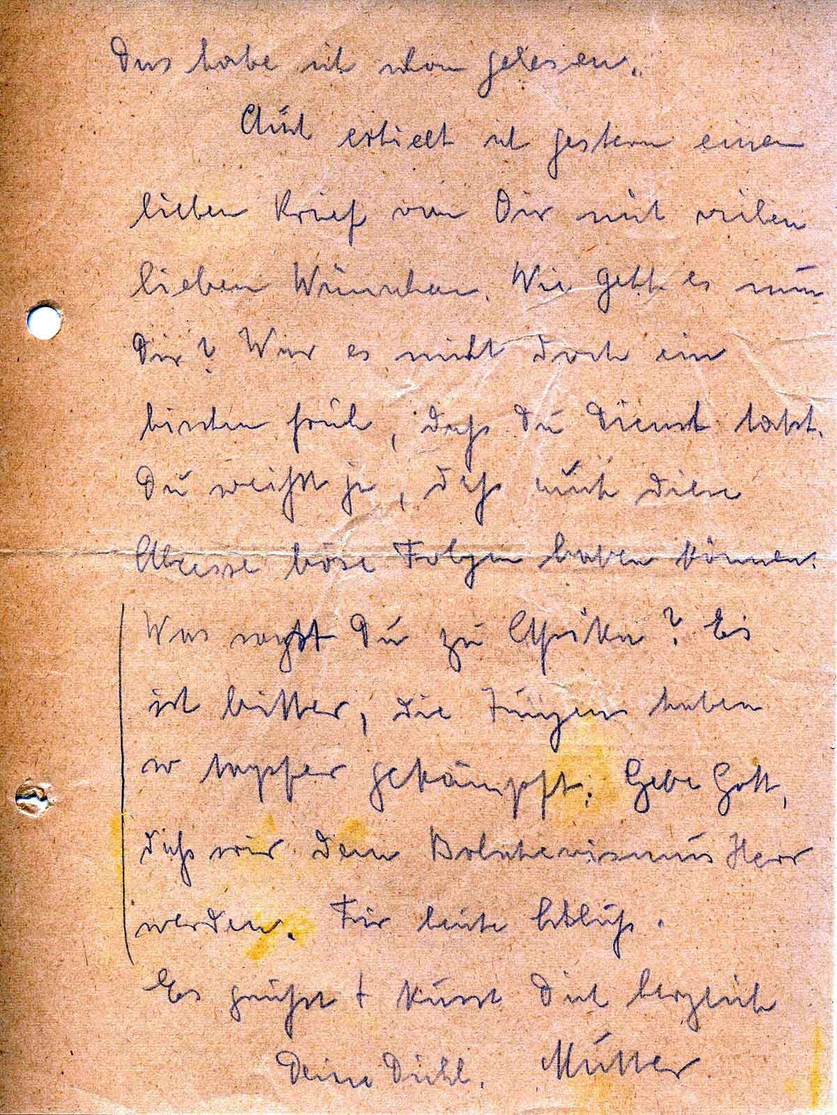 Auch erhielt ich gestern einen lieben Brief von Dir mit vielen lieben Wünschen. Wie geht es nun Dir? War es nicht doch ein bischen früh, daß Du Dienst tatst. Du weißt ja, daß auch diese Abzesse böse Folgen haben können.
