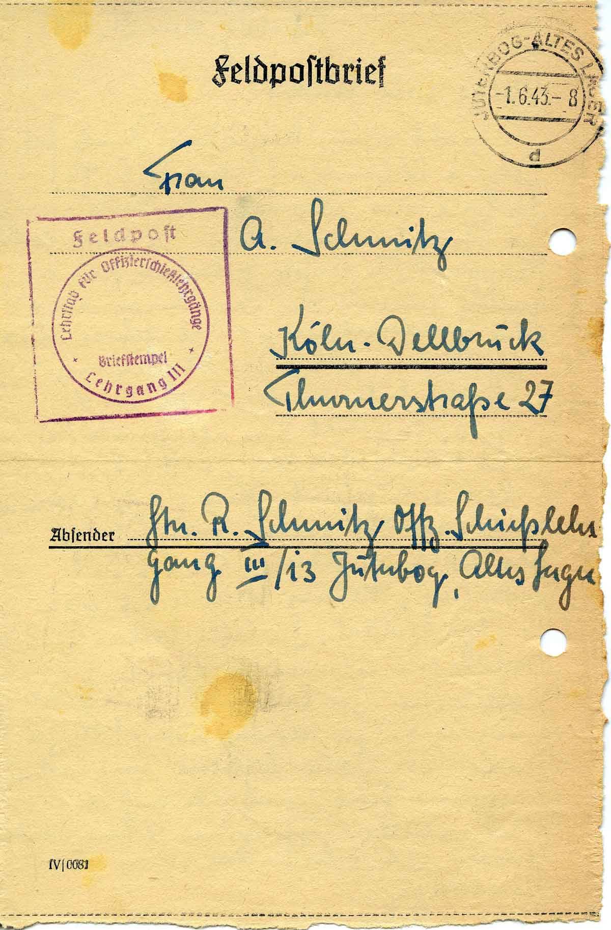 Absender: Ltn. R. Schmitz Offz. Schießlehr-
