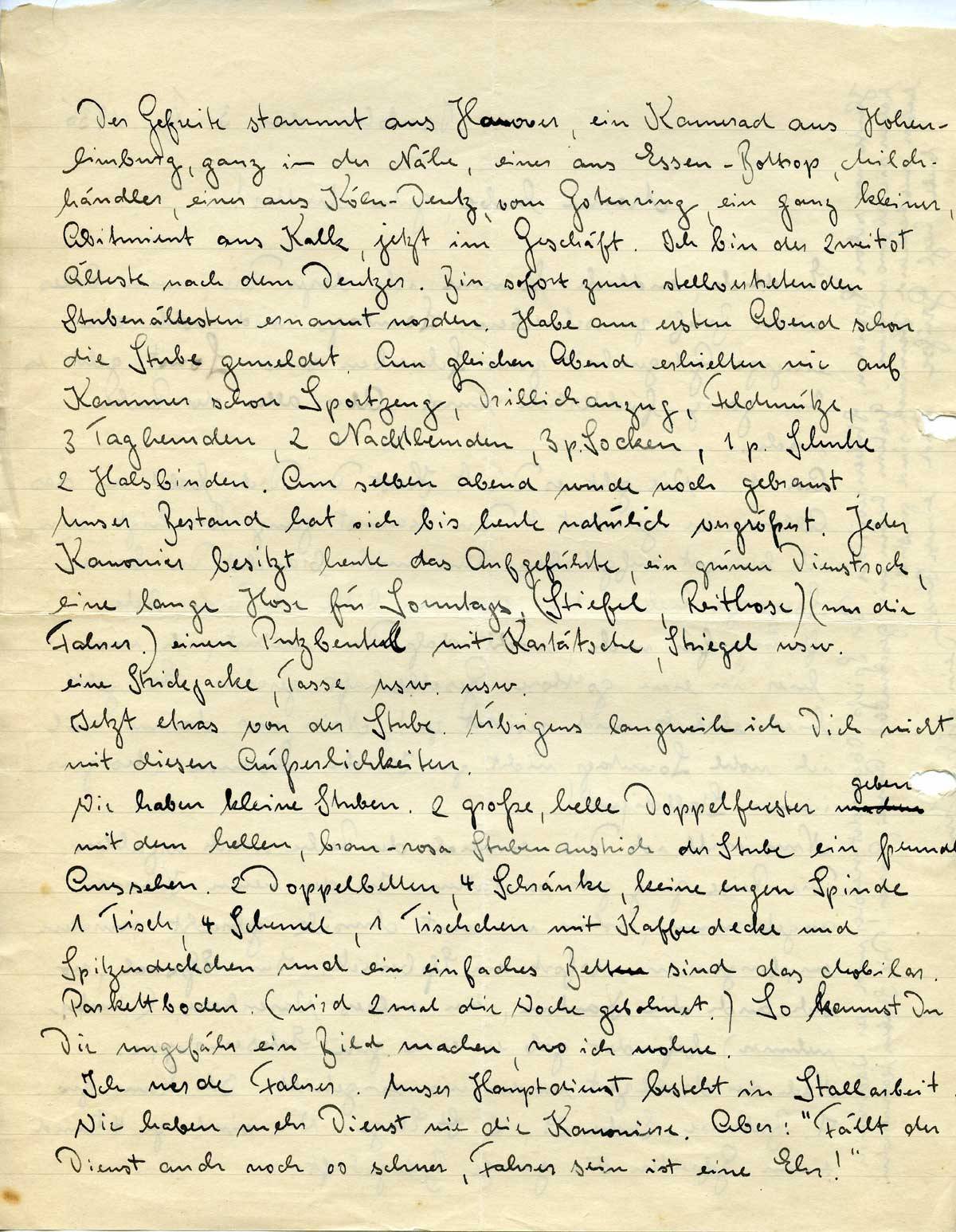 Der Gefreite stammt aus Hannover, ein Kamerad aus Hohenlimburg, ganz in der Nähe, einer aus Essen-Bottrop, Milchhändler, einer aus Köln-Deutz, vom Gotenring, ein ganz kleiner, Abiturient aus Kalk, jetzt im Geschäft. Ich bin der zweitst Älteste nach dem Deutzer. Bin sofort zum stellvertretenden Stubenältesten ernannt worden. Habe am ersten Abend schon die Stube gemeldet. Am gleichen Abend erhielten wir auf Kammer schon Sportzeug, Drillichanzug, Feldmütze, 3 Taghemden, 2 Nachthemden, 3 p. Socken, 1 p. Schuhe 2 Halsbinden. Am selben Abend wurde noch gebraust. Unser Bestand hat sich bis heute natürlich vergrößert. Jeder Kanonier besitzt heute das Aufgeführte, ein grünen Dienstrock, eine lange Hose für Sonntags, (Stiefel, Reithose) (nur die Fahrer.) einen Putzbeutel mit Kartätsche, Striegel usw. eine Strickjacke, Tasse usw. usw.