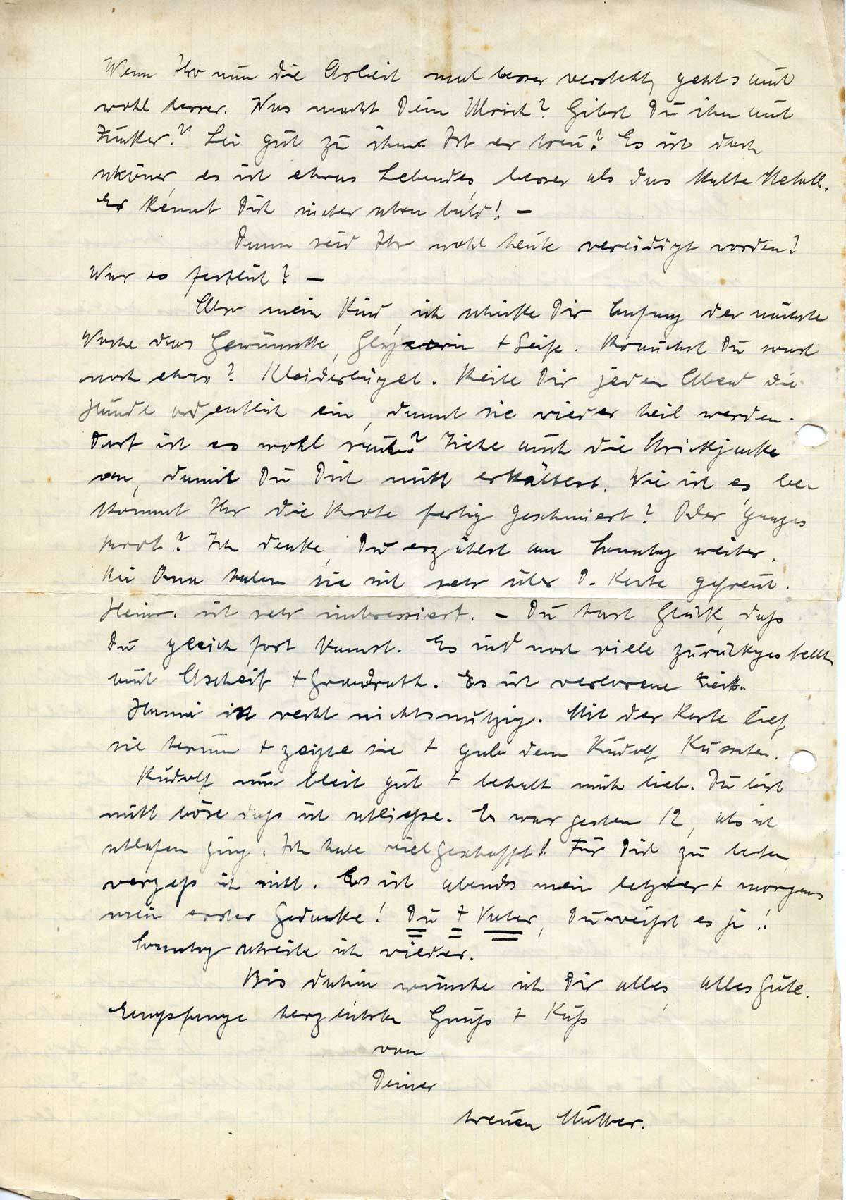 Rudolf nun bleib gut + behalt mich lieb. Du bist nicht böse daß ich schließe. Es war gestern 12, als ich schlafen ging. Ich habe viel geschafft! Für Dich zu beten, vergeß ich nicht. Es ist abends mein letzter + morgens mein erster Gedanke! Du + Vater, Du weißt es ja!