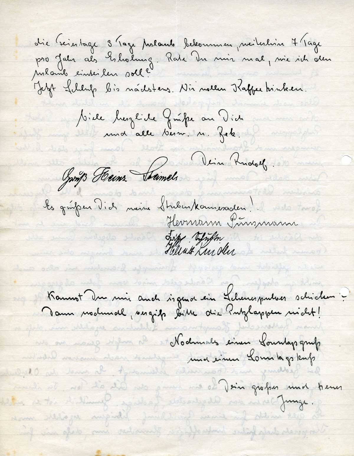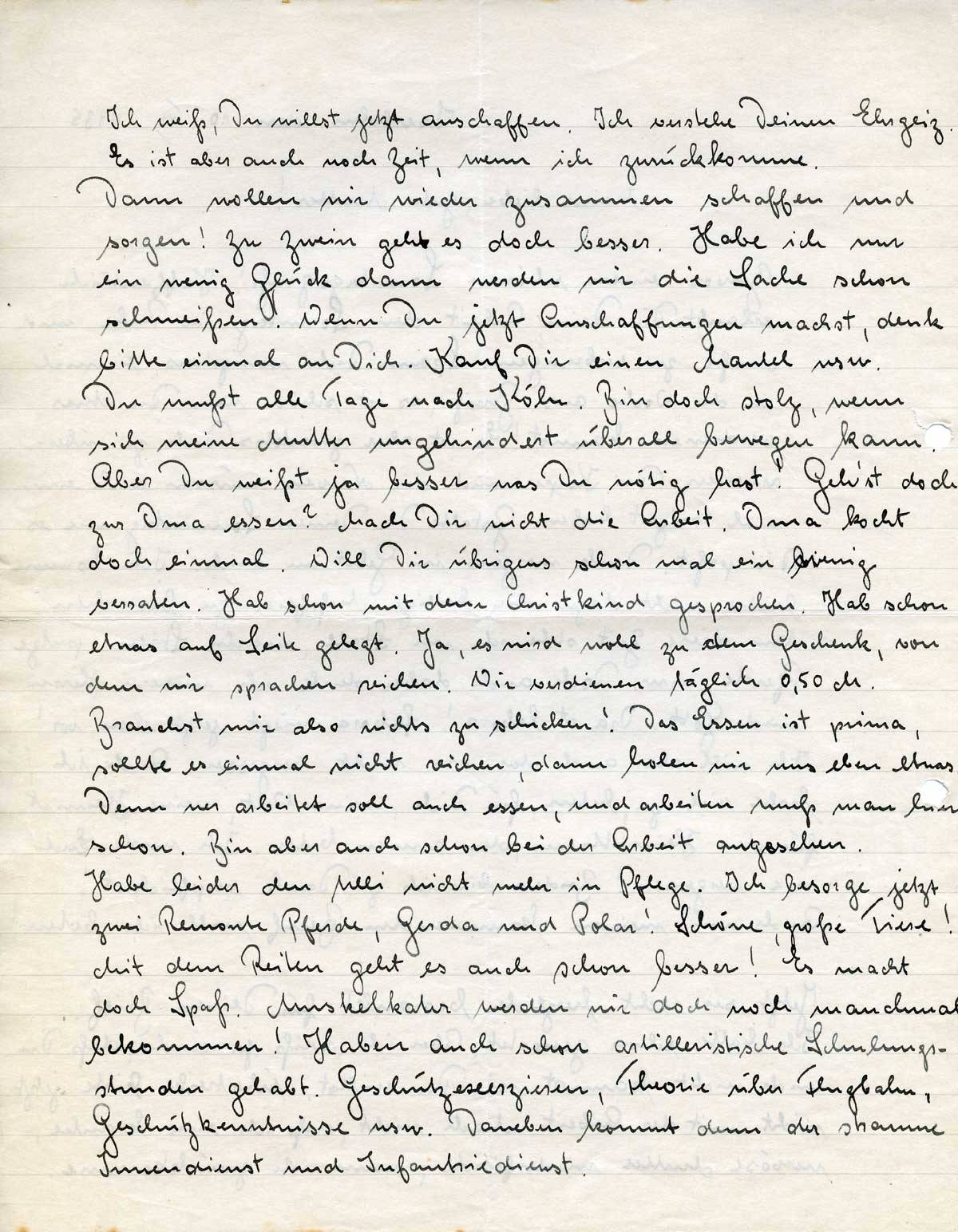 Ich weiß, Du willst jetzt anschaffen. Ich verstehe Deinen Ehrgeiz. Es ist aber auch noch Zeit, wenn ich zurückkomme. Dann wollen wir wieder zusammen schaffen und sorgen! Zu Zwein geht es doch besser. Habe ich nur ein wenig Glück dann werden wir die Sache schon schmeißen. Wenn Du jetzt Anschaffungen machst, denk bitte einmal an Dich. Kauf Dir einen Mantel usw. Du mußt alle Tage nach Köln. Bin doch stolz, wenn sich meine Mutter ungehindert überall bewegen kann. Aber Du weißt ja besser was Du nötig hast! Geh’st doch zur Oma essen? Mach Dir nicht die Arbeit. Oma kocht doch einmal. Will Dir übrigens schon mal ein wenig verraten. Hab schon mit dem Christkind gesprochen. Hab schon etwas auf Seite gelegt. Ja, es wird wohl zu dem Geschenk, von dem wir sprachen reichen. Wir verdienen täglich 0,50 M. Brauchst mir also nichts zu schicken! Das Essen ist prima, sollte es einmal nicht reichen, dann holen wir uns eben etwas. Denn wer arbeitet soll auch essen, und arbeiten muß man hier schon. Bin aber auch schon bei der Arbeit angesehen.