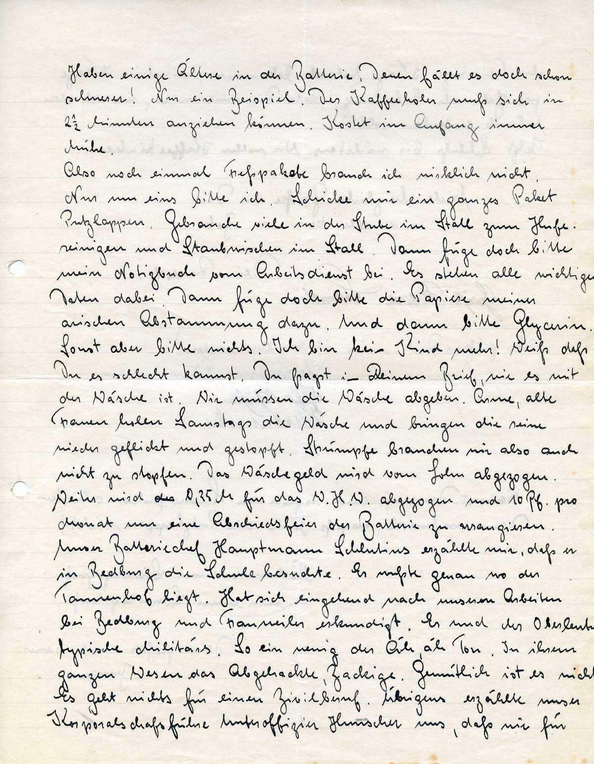 Also noch einmal Freßpakete brauch ich wirklich nicht. Nur um eins bitte ich. Schicke mir ein ganzes Paket Putzlappen. Gebrauche viele in der Stube im Stall zum Hufereinigen und Staubwischen im Stall. Dann füge doch bitte mein Notizbuch vom Arbeitsdienst bei. Es stehen alle wichtigen Daten dabei. Dann füge doch bitte die Papiere meiner arischen Abstammung dazu. Und dann bitte Glycerin. Sonst aber bitte nichts. Ich bin kein Kind mehr! Weiß daß Du es schlecht kannst. Du fragst in Deinem Brief, wie es mit der Wäsche ist. Wir müssen die Wäsche abgeben. Arme, alte Frauen holen Samstags die Wäsche und bringen die reine wieder geflickt und gestopft. Strümpfe brauchen wir also auch nicht zu stopfen. Das Wäschegeld wird vom Lohn abgezogen. Weiter wird 0,25 M für das W.H.W. abgezogen und 10 Pf. pro Monat um eine Abschiedsfeier der Batterie zu arrangieren. Unser Batteriechef Hauptmann Schlutius erzählte mir, daß er in Bedburg die Schule besuchte. Er wußte genau wo der Tannenhof liegt. Hat sich eingehend nach unseren Arbeiten bei Bedburg und Frauweiler erkundigt. Er und der Oberleutnant typische Militärs. So ein wenig der Äh, äh Ton. In ihrem ganzen Wesen das Abgehackte, Zackige. Gemütlich ist es nicht. Es geht nichts für einen Zivilberuf. Übrigens erzählte unser Korporalschaftsführer Unteroffizier Hunscher uns, daß wir für