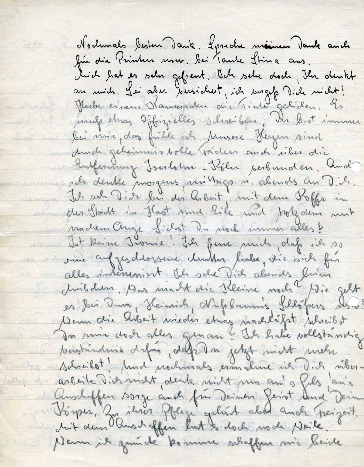 Nochmals besten Dank. Spreche meinen Dank auch für die Printen usw. bei Tante Stina aus. Mich hat es sehr gefreut. Ich sehe doch, Ihr denkt an mich. Sei aber versichert, ich vergeß Dich nicht! Habe einem Kameraden die Tinte geliehen. Er muß etwas Offizielles schreiben. Du bist immer bei mir, das fühle ich. Unsere Herzen sind durch geheimnisvolle Fäden auch über die Entfernung Iserlohn-Köln verbunden. Auch ich denke morgens, mittags u. abends an Dich. Ich seh Dich bei der Arbeit, mit dem Koffer in der Stadt in Hast und Eile und trotzdem mit wachem Auge. Siehst Du noch immer alles? Ist keine Ironie! Ich freue mich, daß ich so eine aufgeschlossene Mutter habe, die sich für alles interessiert. Ich sehe Dich abends beim Mübchen. Was macht die Kleine noch? Wie geht es bei Oma, Heinrich, Nußbaum’s, Schlößers usw.? Wenn die Arbeit wieder etwas nachläßt schreibst Du mir doch alles genau? Ich habe vollständig Verständnis dafür, daß Du jetzt nicht mehr schreibst! Und nochmals ermahne ich Dich, überarbeite Dich nicht, denk nicht nur an’s Geld, an’s Anschaffen sorge auch für Deinen Geist und Deinen Körper. Zu ihrer Pflege gehört aber auch Freizeit. Mit dem Anschaffen hat es doch noch Weile. Wenn ich zurück komme schaffen wir beide