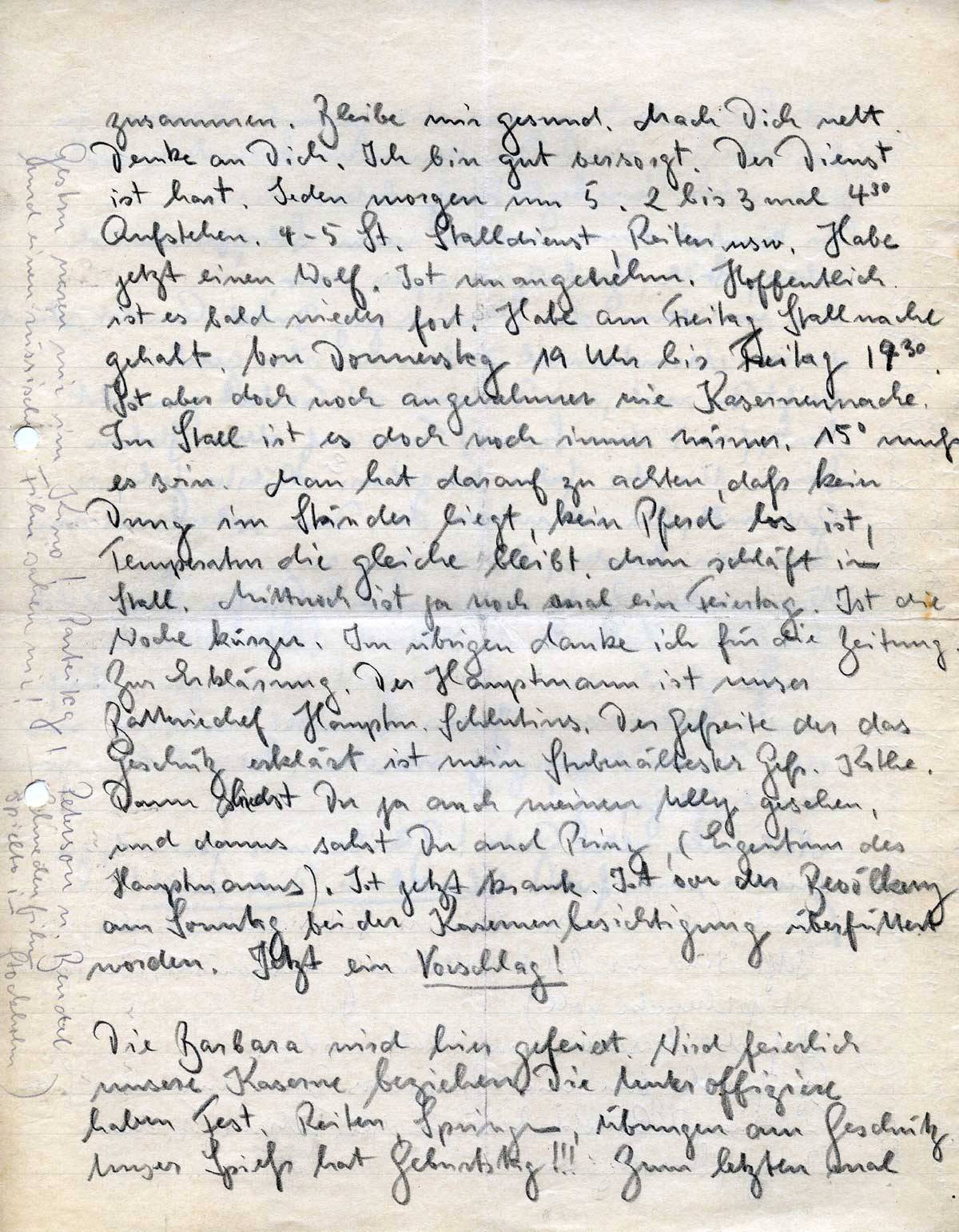 zusammen. Bleibe mir gesund. Mach Dich nett. Denke an Dich. Ich bin gut versorgt. Der Dienst ist hart. Jeden morgen um 5, 2 bis 3 mal 4.30 Aufstehen. 4-5 St. Stalldienst, Reiten usw. Habe jetzt einen Wolf. Ist unangenehm. Hoffentlich ist es bald fort. Habe am Freitag Stallwache gehabt. Von Donnerstag 19 Uhr bis Freitag 19.30. Ist aber doch noch angenehmer wie Kasernenwache. Im Stall ist es doch noch immer wärmer. 15° muß er sein. Man hat darauf zu achten, daß kein Dung im Ständer liegt, kein Pferd los ist, Temperatur die gleiche bleibt. Man schläft im Stall. Mittwoch ist ja noch mal ein Feiertag. Ist die Woche kürzer. Im übrigen danke ich für die Zeitung. Zur Erklärung. Der Hauptmann ist unser Batteriechef Hauptm. Schlutius. Der Gefreite der das Geschütz erklärt ist mein Stubenältester Gefr. Kothe. Dan hast Du ja auch meinen Ully gesehen, und dann sahst Du auch Prinz, (Eigentum des Hauptmanns). Ist jetzt krank. Ist von der Bevölkerung am Sonntag bei der Kasernenbesichtigung überfüttert worden. Jetzt ein Vorschlag!
