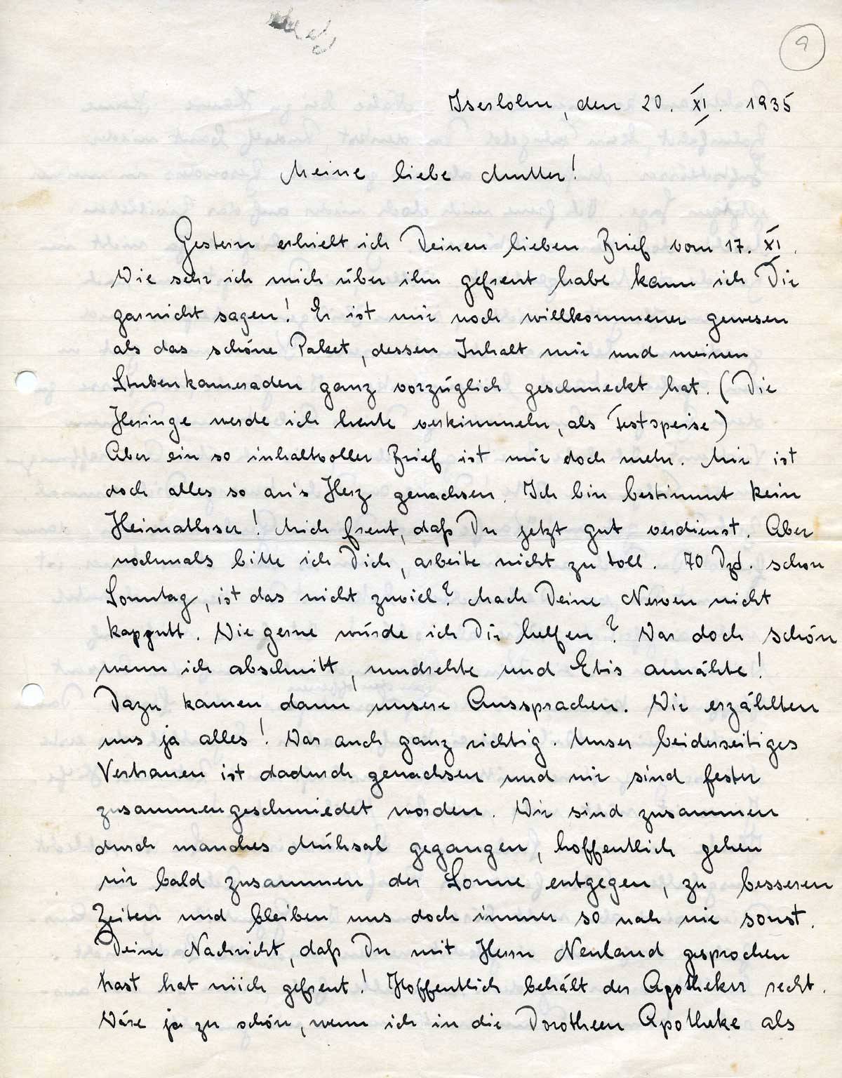 Gestern erhielt ich Deinen lieben Brief vom 17.XI. Wie sehr ich mich über ihn gefreut habe kann ich Dir gar nicht sagen! Er ist mir noch willkommener gewesen als das schöne Paket, dessen Inhalt mir und meinen Stubenkameraden ganz vorzüglich geschmeckt hat. (Die Heringe werde ich heute verkimmeln, als Festspeise) Aber ein so inhaltvoller Brief ist mir doch mehr. Mir ist doch alles so an’s Herz gewachsen. Ich bin bestimmt kein Heimatloser! Mich freut, daß Du jetzt gut verdienst. Aber nochmals bitte ich Dich, arbeite nicht zu toll. 70 Dzd. schon Sonntag, ist das nicht zuviel? Mach Deine Nerven nicht kaputt. Wie gerne würde ich Dir helfen? War doch schön wenn ich abschnitt, umdrehte und Etis annähte! Dazu kamen dann unsere Aussprachen. Wir erzählten uns ja alles! War auch ganz richtig. Unser beiderseitiges Vertrauen ist dadurch gewachsen und wir sind fester zusammengeschmiedet worden. Wir sind zusammen durch manches Mühsal gegangen, hoffentlich gehen wir bald zusammen der Sonne entgegen, zu besseren Zeiten und bleiben uns doch immer so nah wie sonst. Deine Nachricht, daß Du mit Herrn Neuland gesprochen hast hat mich gefreut! Hoffentlich behält der Apotheker recht. Wäre ja zu schön, wenn ich in die Dorotheen Apotheke als