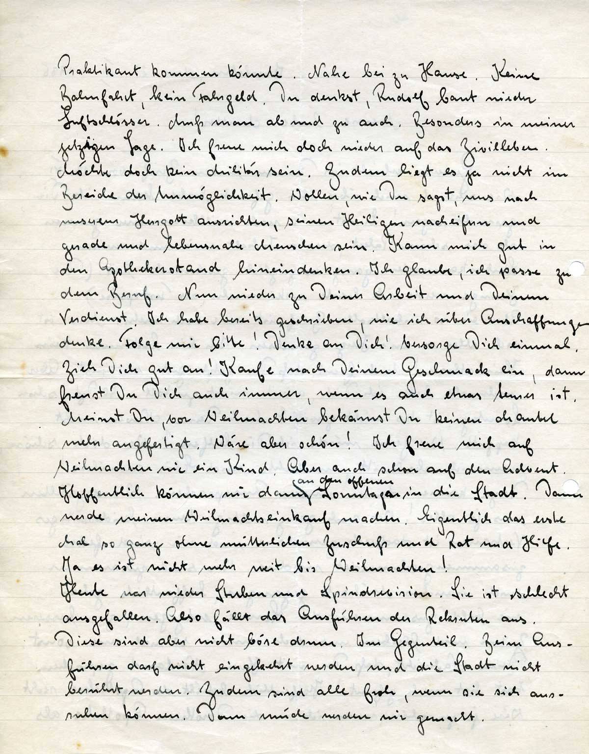 Praktikant kommen könnte. Nahe bei zu Hause. Keine Bahnfahrt, kein Fahrgeld. Du denkst, Rudolf baut wieder Luftschlösser. Muß man ab und zu auch. Besonders in meiner jetzigen Lage. Ich freue mich doch wieder auf das Zivilleben. Möchte doch kein Militär sein. Zudem liegt es ja nicht im Bereiche der Unmöglichkeit. Wollen, wie Du sagst, uns nach unserem Herrgott ausrichten, seinen Heiligen nacheifern und gerade und lebensnahe Menschen sein. Kann mich gut in den Apothekerstand hineindenken. Ich glaube, ich passe zu dem Beruf. Nun wieder zu Deiner Arbeit und Deinem Verdienst. Ich habe bereits geschrieben, wie ich über Anschaffungen denke. Folge mir bitte! Denke an Dich! Versorge Dich einmal. Zieh Dich gut an! Kaufe nach Deinem Geschmack ein, dann freust Du Dich auch immer, wenn es auch etwas teurer ist. Meinst Du, vor Weihnachten bekämst Du keinen Mantel mehr angefertigt. Wäre aber schön! Ich freue mich auf Weihnachten wie ein Kind. Aber auch schon auf den Advent. Hoffentlich können wir dann an den offenen Sonntagen in die Stadt. Dann werde meinen Weihnachtseinkauf machen. Eigentlich das erste Mal so ganz ohne mütterlichen Zuschuß und Rat und Hilfe. Ja es ist nicht mehr weit bis Weihnachten!