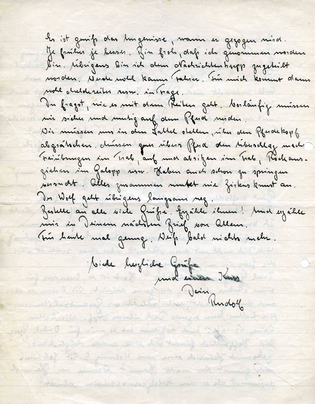 Jeden Tag Reiten. Bedeutet auch eine körperliche Anstrengung. Jeden Tag Stalldienst. (Pferdeputzen, Stallsäubern, Häckselschneiden usw.) Jeden Tag Apell. Dazu kommt noch Artl. Unterricht und Dienst, Inf. Ausbildung. Jetzt auch Karabinerreinigen und Gewehrexerzieren und Freiübungen mit der 9 Pfund schweren Knarre. Alles in allem arbeitsreiche Tage, die verfliegen ehe man es denkt. Trotzt Müdigkeit und Muskelkater fühle ich mich gesund und bin froh und munter!