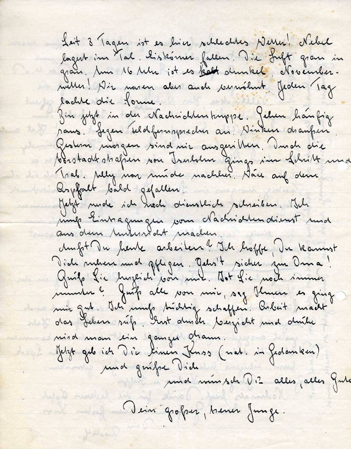 Mußt Du heute arbeiten? Ich hoffe, Du kannst Dich ruhen und pflegen. Gehs’t sicher zur Oma! Grüß Sie herzlich von mir. Ist Sie noch immer munter? Grüß alle von mir, sag Ihnen es ging mir gut. Ich muß tüchtig schaffen. Arbeit macht das Leben süß. Erst durch Verzicht und Mühe wird man ein ganzer Mann.