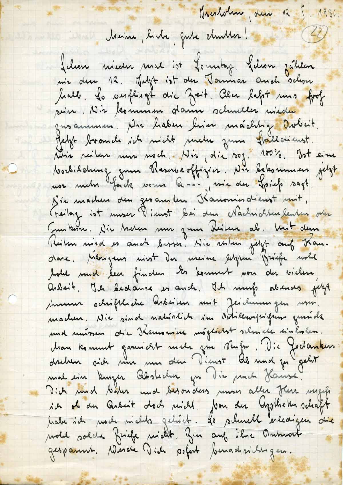 Schon wieder mal ist Sonntag. Schon zählen wir den 12. Jetzt ist der Januar auch schon halb. So verfliegt die Zeit. Aber laßt uns froh sein. Wir kommen dann schneller wieder zusammen. Wir haben hier mächtig Arbeit. Jetzt brauch ich nicht mehr zum Stalldienst. Wir reiten nur noch. Wir, die sog. 100 %. Ist eine Vorbildung zum Reserveoffizier. Wir bekommen jetzt was mehr Lack vorm A---, wie der Spieß sagt. Wir machen den gesamten Kanonierdienst mit, Freitag ist unser Dienst bei den Nachrichtenleuten oder Funkern. Wir treten nur zum Reiten ab. Mit dem Reiten wird es auch besser. Wir reiten jetzt auf Kandare. Übrigens wirst Du meine letzten Briefe wohl hohl und leer finden. Es kommt von der vielen Arbeit. Ich bedaure es auch. Ich muß abends jetzt immer schriftliche Arbeiten mit Zeichnungen usw. machen. Wir sind natürlich im Artilleristischen zurück und müssen die Kanoniere möglichst schnell einholen. Man kommt garnicht mehr zur Ruhe. Die Gedanken drehen sich nur um den Dienst. Ab und zu geht mal ein kurzer Abstecher zu Dir, nach Hause. Dich und Vater und besonders unser aller Herr vergeß ich ob der Arbeit doch nicht. Von der Apothekerschaft habe ich noch nichts gehört. So schnell erledigen die wohl solche Briefe nicht. Bin auf ihre Antwort gespannt. Werde Dich sofort benachrichtigen.