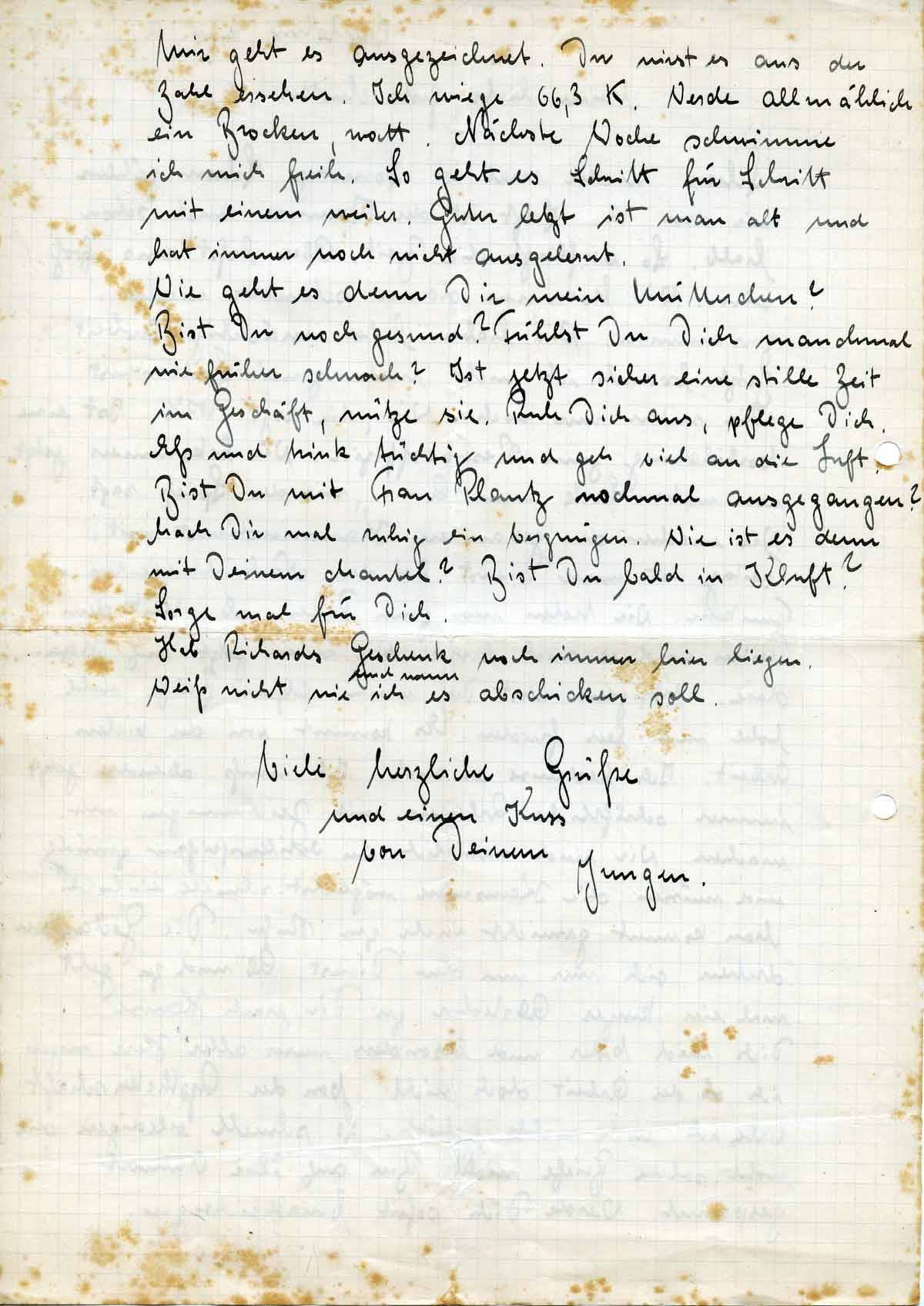 Wie geht es denn Dir mein Mütterchen? Bist Du noch gesund? Fühlst Du Dich manchmal wie früher schwach? Ist jetzt sicher eine stille Zeit im Geschäft, nütze sie. Ruh Dich aus, pflege Dich. Eß und trink tüchtig und geh viel an die Luft. Bist Du mit Frau Plantz nochmal ausgegangen? Mach Dir mal ruhig ein Vergnügen. Wie ist es denn mit Deinem Mantel? Bist Du bald in Kluft? Sorge mal für Dich.