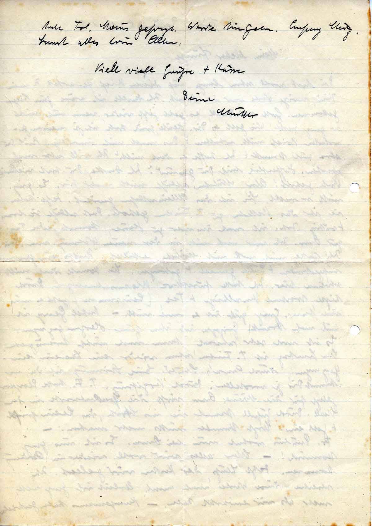 Du hast wohl schon lange auf diesen Brief gewartet. Ja mein Kind, vorige Woche war ich krank. Ich dachte, ich wäre zum Liegen gekommen. Gott sei Dank, es geht jetzt wieder, wenn auch nicht so ganz recht! Wie geht es Dir. Heute früh habe ich ja meinen gewarteten Brief nicht erhalten? Das macht mich unruhig. Bist Du etwa auch krank? Ich hoffe es doch nicht? Ich will also mal warten. Hoffentlich bist Du gesund? Ich denke, Du hast vielleicht Wache gehabt! Also, Mübchen schläft nicht mehr hier. Es ging nicht so recht. Sie ist das Alleinschlafen gewöhnt. Jetzt haben sie ihr das Bettchen zu T. Finchen geholt. Dort schläft sie brav + ruhig. Joh. ist noch immer zu Hause, kommt jeden Tag zur Oma. Ich war noch nicht in der neuen Wohnung von Heinr. Ich hatte mich wohl mit Mübchen erkältet. Nachts ein paarmal aufgestanden + Pulla gemacht + getragen. Sie konnte doch nicht schreien hier. Ich hatte furchtbare Blasenschmerzen. Durch heiße, trockene Umschläge + Tee, ([..]) geht es mir doch besser. Ganz gut ist es noch nicht. – Onkel Georg ist auch noch krank. Grippe ist ihm zum Herzen gezogen. Er ist noch sehr schwach, kann noch nicht herausgehen. Am Sonntag ist T. Finchen schon wieder ein Schwein eingegangen, durch Oma’s Schuld. Eine Stimmung ist da, na, kannst Dir ja vorstellen. Durch Vergiftung. T. F. hatte Phosphor gelegt für die Mäuse. Oma wirft die Speckschwarte in den Stall. Durch Zufall kommt sie ins Stroh, das Schwein frißt + geht ein. Arzt konnte nichts mehr machen. –