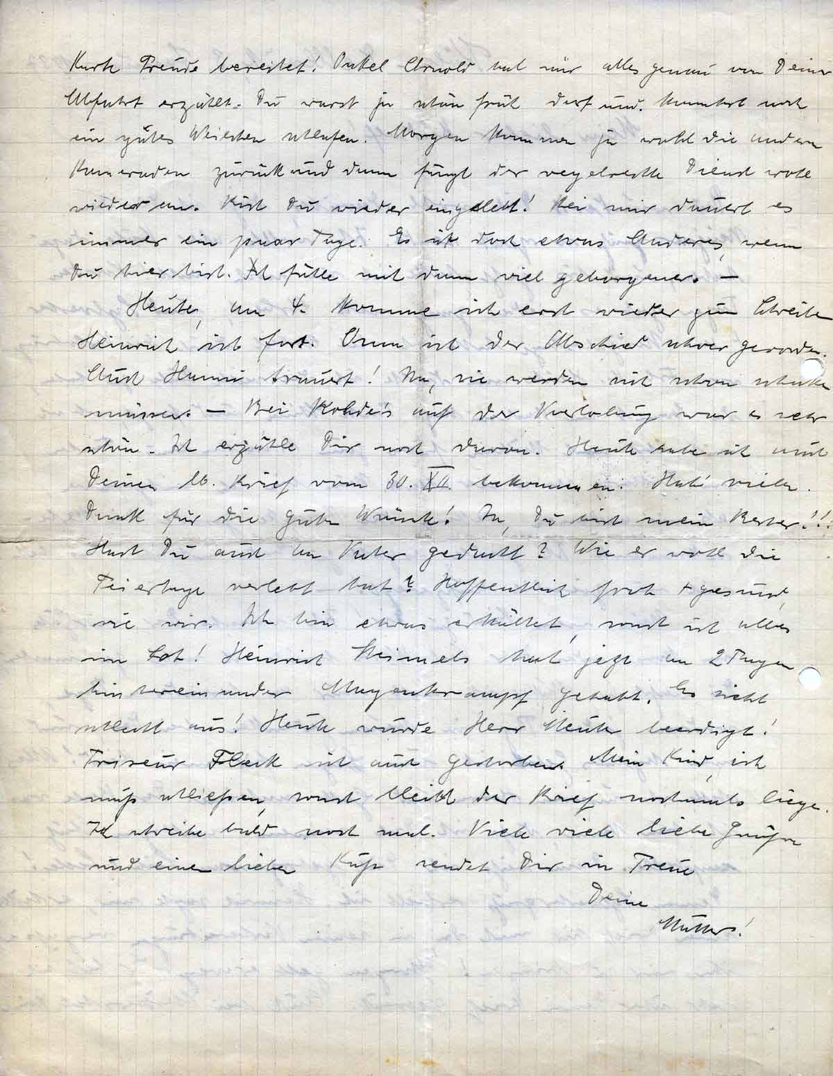 Heute, am 4. komme ich erst wieder zum Schreiben. Heinrich ist fort. Oma ist der Abschied schwer geworden. Auch Hanni trauert! Na, sie werden sich schon schicken müssen. – Bei Rohde’s auf der Verlobung war es sehr schön. Ich erzähle Dir noch davon. Heute habe ich auch Deinen lb. Brief vom 30. XII. bekommen. Hab’ vielen Dank für die guten Wünsche! Ja, Du bist mein Bester!!! Hast Du auch an Vater gedacht? Hoffentlich froh + gesund, wie wir. Ich bin etwas erkältet, sonst ist alles im Lot! Heinrich Steimels hat jetzt an 2 Tagen hintereinander Magenkrampf gehabt. Es sieht schlecht aus! Heute wurde Herr Steute beerdigt! Friseur Fleck ist auch gestorben. Mein Kind, ich muß schließen, sonst bleibt der Brief nochmals liegen. Ich schreibe bald noch mal. Viele viele liebe Grüße und einen lieben Kuß sendet Dir in Treue