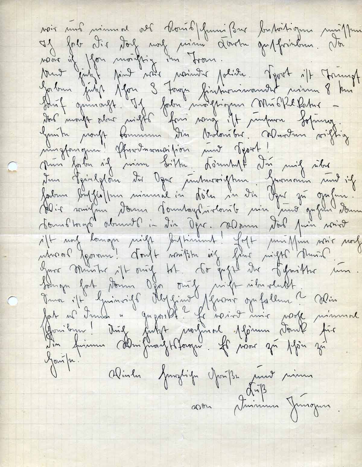 Auch wenn ich heute Deinen lieben Brief nicht erhalten hätte, hätte ich Dir, liebe Mutter, geschrieben. Beunruhigt war ich gerade nicht, ich wusste ja, dass Du Silvester und Neujahr keine Zeit zum Schreiben haben würdest und ich konnte mir schon denken, dass Du wieder mehr Arbeit hattest, denn sonst gäbe es doch gar keinen anderen Grund Deines Schweigens, wohl? Hattest Du Dich wieder erkältet? Wohl bei Rhodes? Hoffentlich war es das letzte Mal, dass Du so eine Arbeit angenommen hast. Hat es Dir denn sonst gefallen? Waren sie nett zu Dir? Schreibe mir nur gesund! Ich bitte den lieben Gott darum! Für Deine lieben Neujahrsgrüße den besten Dank.