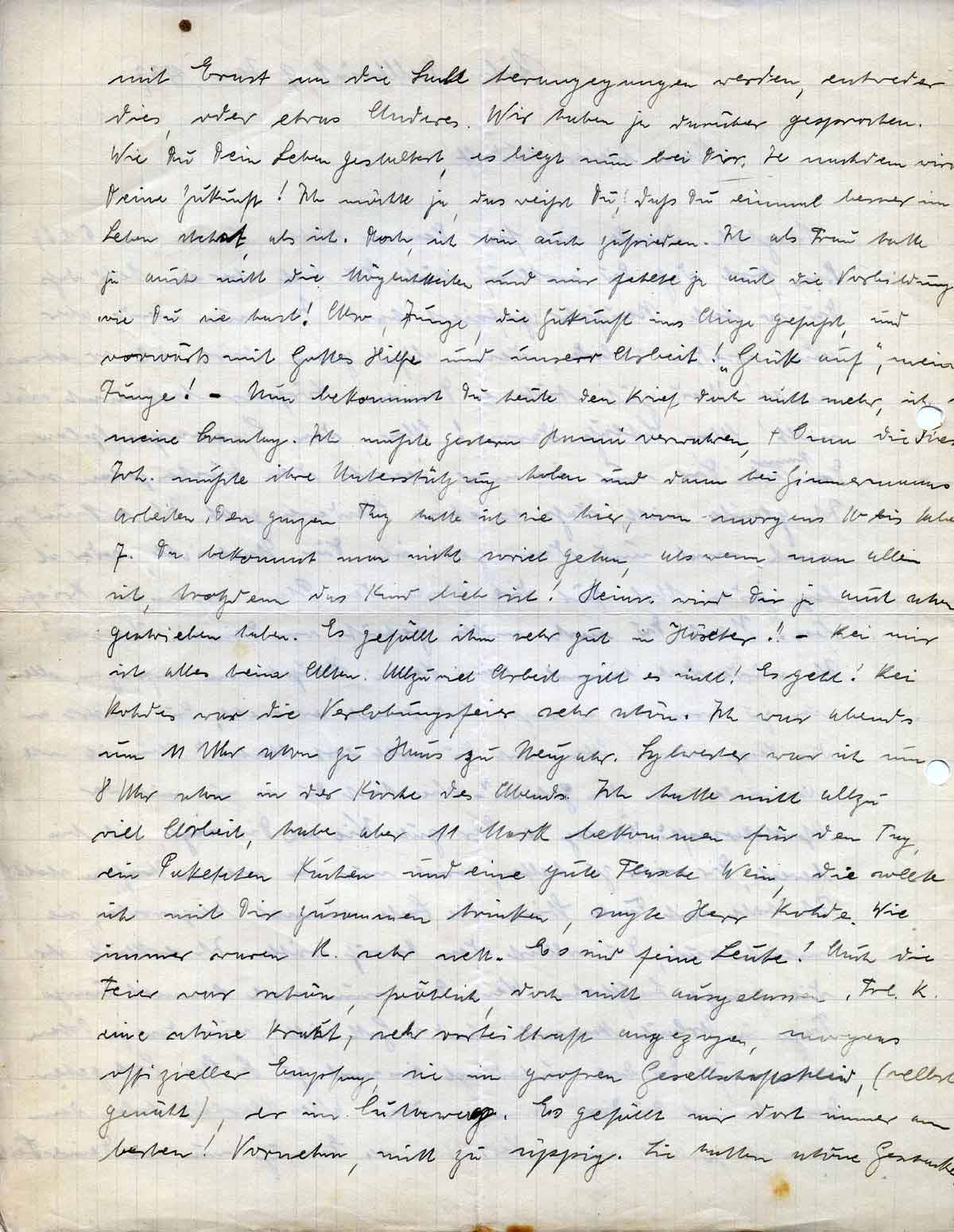 Mein Junge, heute ist das Fest der hlg. Familie. Gebe Gott, daß auch in unserer Familie der rechte Friede einkehrt, zwischen Vater, Dir + mir! Denkst Du auch an das Gebet? Vergiß es nicht! – Vater hat noch nichts geschickt, hoffentlich kommt morgen etwas an. Nun aber wirklich Schluß.