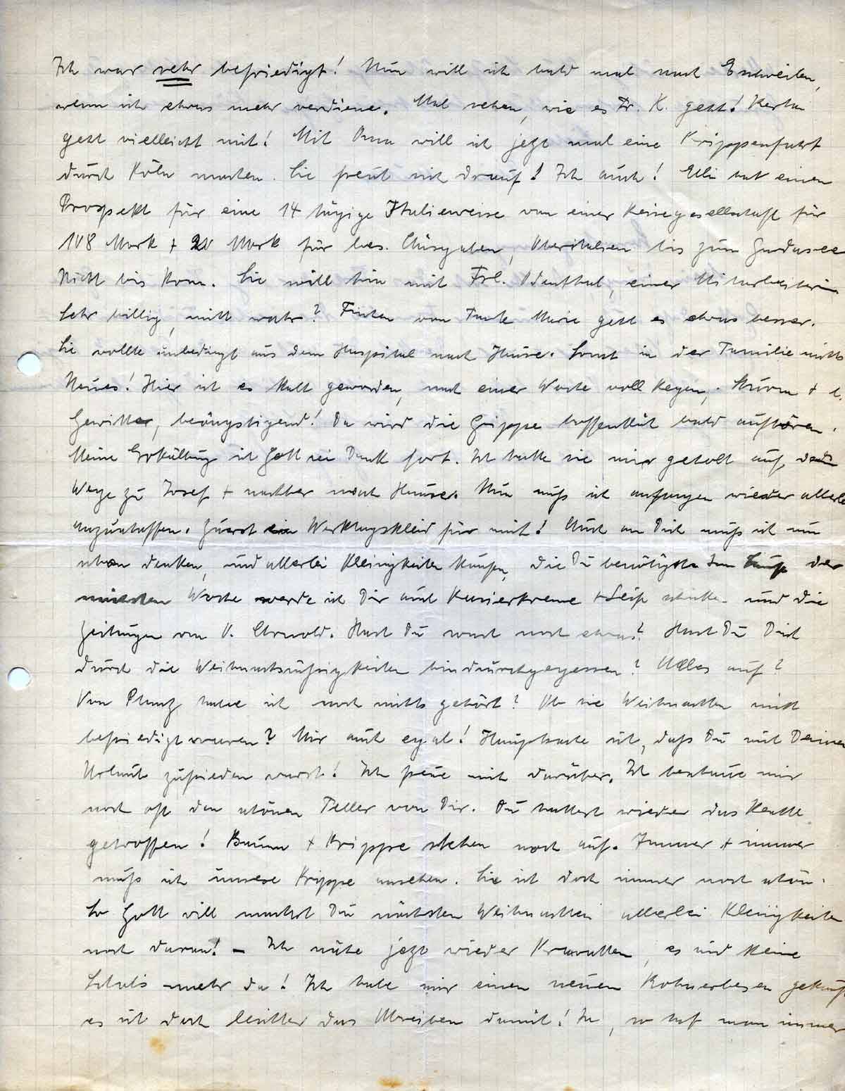 Ich war sehr befriedigt! Nun will ich bald mal nach Eschweiler, wenn ich etwas mehr verdiene. Mal sehen, wie es Fr. K. geht! Berta geht vielleicht mit! Mit Oma will ich jetzt mal eine Krippenfahrt durch Köln machen. Sie freut sich darauf! Ich auch! Elli hat einen Prospekt für eine 14tägige Italienreise von einer Reisegesellschaft für 108 Mark + 2 Mark für bes. Ausgaben, Oberitalien bis zum Gardasee. Nicht bis Rom. Sie will hin mit Frl. Odenthal, einer Mitarbeiterin. Sehr billig, nicht wahr? Finchen von Tante Marie geht es etwas besser. Sie wollte unbedingt aus dem Hospital nach Hause. Sonst in der Familie nichts Neues! Hier ist es kalt geworden, nach einer Woche voll Regen, Sturm + Gewitter, beängstigend! Da wird die Grippe hoffentlich bald aufhören. Meine Erkältung ist Gott sei Dank fort. Ich hatte sie mir geholt auf dem Wege zu Josef + nachher nach Hause. Nun muß ich anfangen wieder allerlei anzuschaffen. Zuerst ein Werktagskleid für mich! Auch an Dich muß ich nun schon denken, und allerlei Kleinigkeiten kaufen, die Du benötigst. Im Laufe der nächsten Woche werde ich Dir auch Rasierkreme + Seife schicken und die Zeitungen von O. Arnold. Hast Du sonst noch etwas? Hast Du Dich durch die Weihnachtssüßigkeiten hindurchgegessen? Alles auf? Von Plunz habe ich noch nichts gehört? Ob sie Weihnachten nicht befriedigt waren? Mir auch egal! Hauptsache ist, daß Du mit Deinem Urlaub zufrieden warst! Ich freue mich darüber. Ich bestaune mir oft noch den schönen Teller von Dir. Du hattest wieder ins Rechte getroffen! Baum + Krippe stehen noch auf. Immer + immer muß ich unsere Krippe ansehen. Sie ist doch immer noch schön. So Gott will machst Du nächsten Weihnachten allerlei Kleinigkeiten noch daran! – Ich nähe jetzt wieder Kravatten, es sind keine Schals mehr da! Ich habe mir einen neuen Bohnerbesen gekauft, es ist doch leichter das Abreiben damit! Ja, so hat man immer