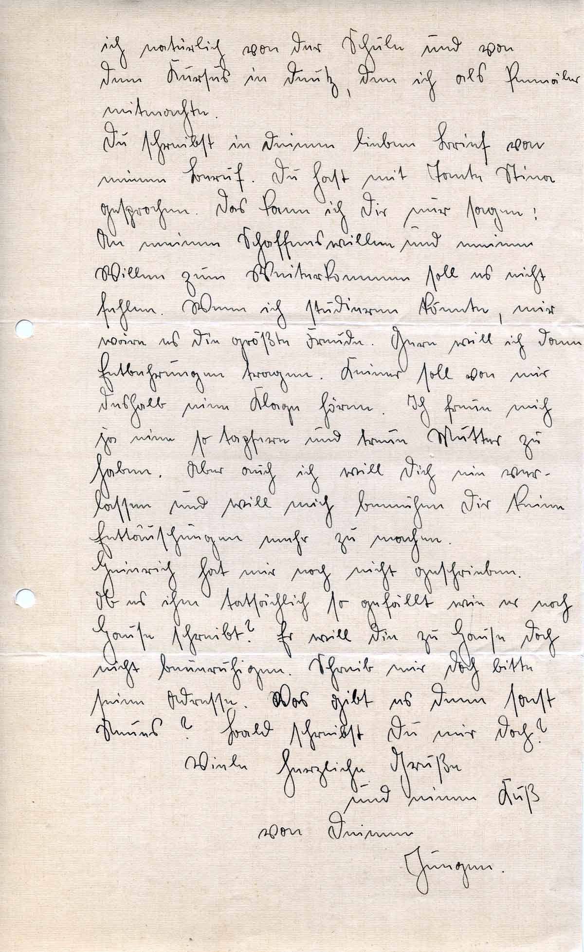 Du schreibst in Deinem lieben Brief von meinem Beruf. Du hast mit Tante Stina gesprochen. Das kann ich Dir nur sagen: An meinem Schaffenswilllen und meinem Willen zum Weiterkommen soll es nicht fehlen. Wenn ich studieren könnte, mir wäre es die größte Freude. Gern will ich dann Entbehrungen tragen. Keiner soll von mir deshalb eine Klage hören. Ich freue mich ja eine so tapfere und treue Mutter zu haben. Aber auch ich will Dich nie verlassen und will mich bemühen Dir keine Enttäuschungen mehr zu machen.