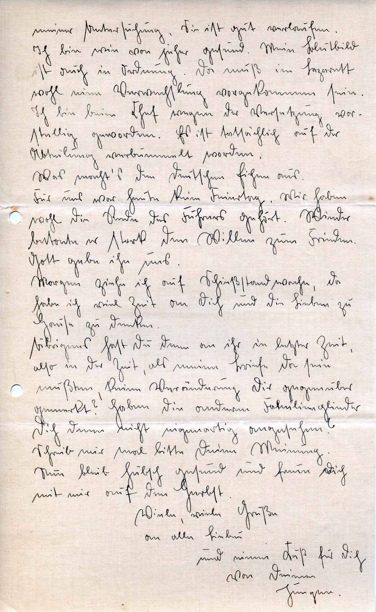 Übrigens hast Du denn an ihr in letzter Zeit, also in der Zeit, als meine Briefe da sein mußten, keine Veränderung Dir gegenüber gemerkt? Haben die anderen Familienglieder Dich denn nicht eigenartig angesehen? Schreib mir mal bitte Deine Meinung.