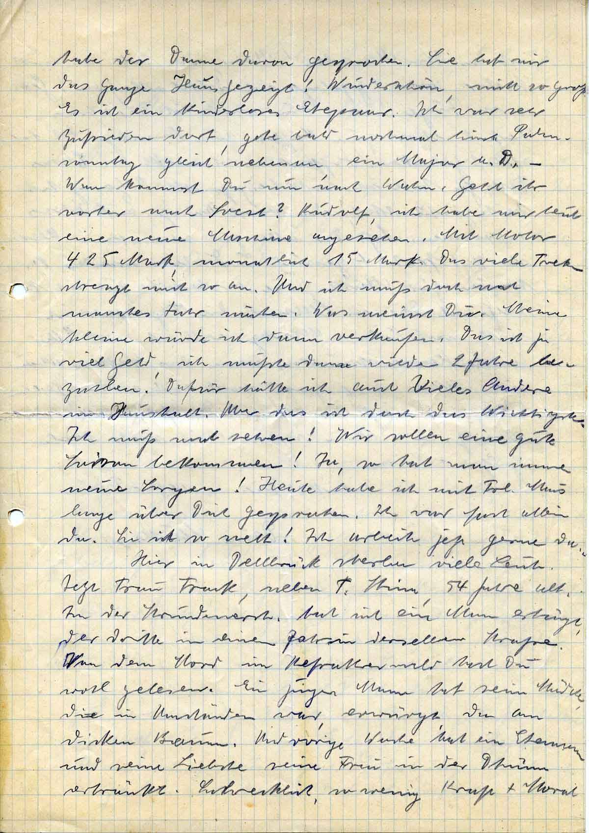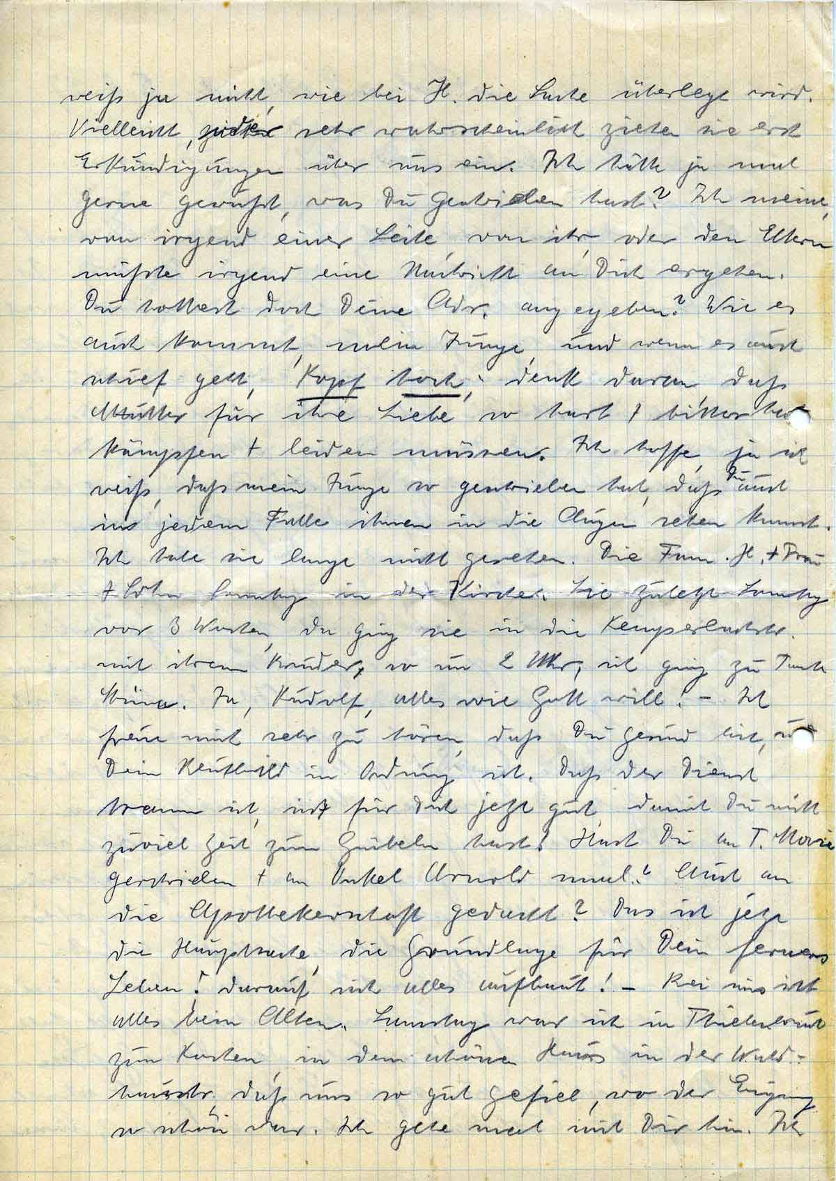 weiß ja nicht, wie bei H. die Sache überlegt wird. Vielleicht, oder sehr wahrscheinlich ziehen sie erst Erkundigungen über uns ein. Ich hätte ja mal gerne gewusst, was Du geschrieben hast? Ich meine, von irgend einer Seite, von ihr, oder den Eltern müsste irgend eine Nachricht an Dich ergehen. Du hattest doch Deine Adresse angegeben? Wie es auch kommt, mein Junge, und wenn es auch schief geht, Kopf hoch; denk daran, dass Mutter für ihre Liebe so hart + bitter hat kämpfen + leiden müssen. Ich hoffe, ja ich weiß, daß mein Junge so geschrieben hat, daß Du auch in jedem Falle ihnen in die Augen sehen kannst. Ich habe sie lange nicht gesehen. Die Fam. H. + Frau + Sohn Sonntag in der Kirche. Sie zuletzt Sonntag vor 3 Wochen, da ging sie in die Kemperendstr. mit ihrem Bruder, so um 2 Uhr, ich ging zu Tante Stine. Ja, Rudolf, alles wie Gott will! - Ich freue mich sehr zu hören, daß Du gesund bist und Dein Reitbild in Ordnung ist. Daß der Dienst stramm ist, ist für Dich jetzt gut, damit Du nicht zuviel Zeit zum Grübeln hast! Hast Du an T. Marie geschrieben + an Onkel Arnold auch? Auch an die Apothekerschaft gedacht? Das ist jetzt die Hauptsache, die Grundlage für Dein ferneres Leben! Darauf sich alles aufbaut! – Bei uns ist alles beim Alten. Sonntag war ich in Thielenbruch zum Kochen, in dem schönen Haus in der Waldhausstr. daß uns so gefiel, wo der Eingang so schön war. Ich gehe mal mit Dir hin. Ich