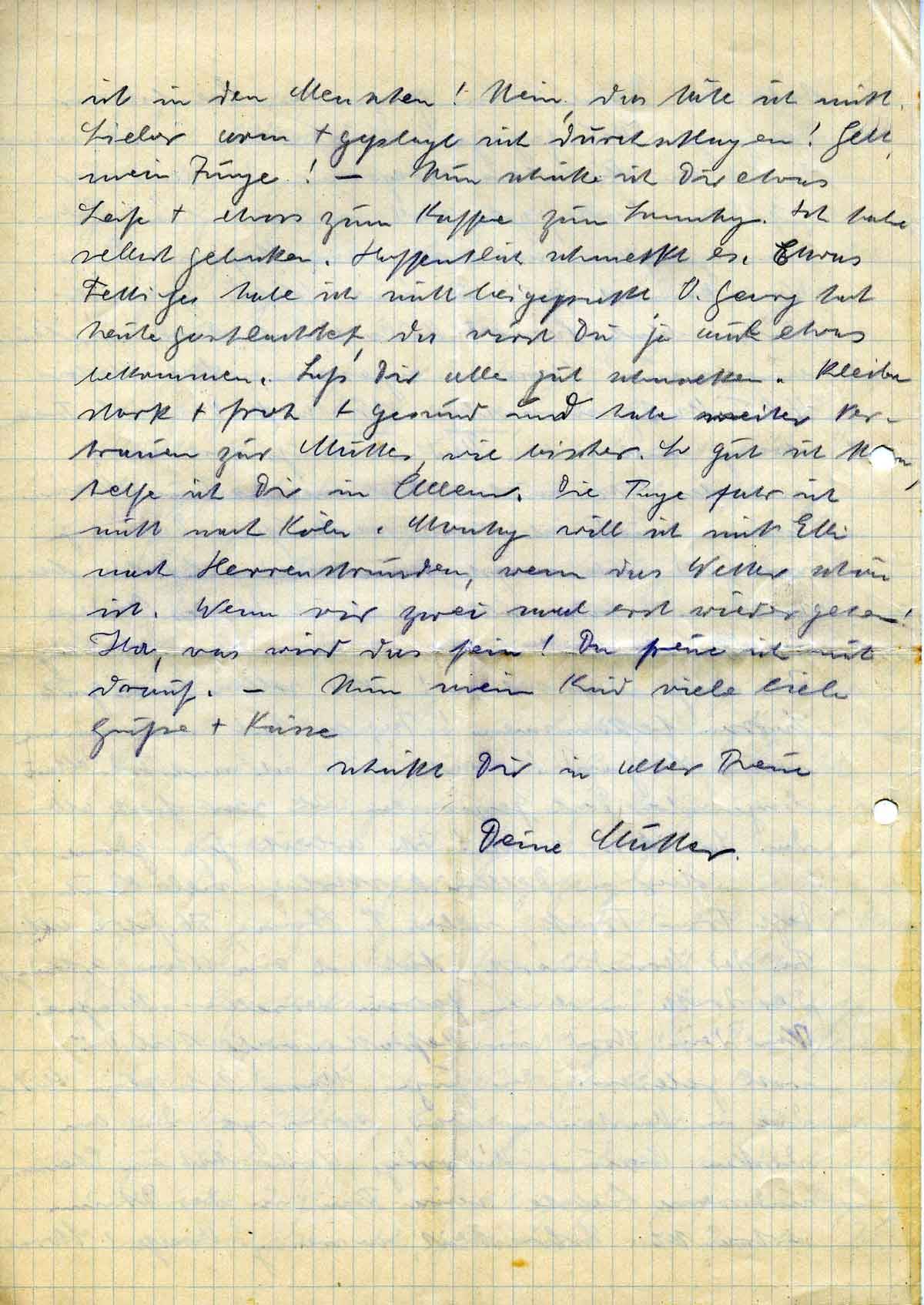 ist in den Menschen! Nein, das täte ich nicht. Lieber arm + geplagt sich durchschlagen! Gell, mein Junge! – Nun schicke ich Dir etwas Seife + etwas zum Kaffee zum Sonntag. Ich habe selbst gebacken. Hoffentlich schmeckt es. Etwas Fettiges habe ich nicht beigepackt. O. Georg hat heute geschlachtet, da wirst Du ja auch etwas bekommen. Laß Dir alles gut schmecken. Bleibe stark + froh + gesund und habe weiter Vertrauen zur Mutter, wie bisher. So gut sie kann, helfe ich Dir in Allem. Die Tage fahr ich nicht nach Köln. Montag will ich mit Elli nach Herrenstrunden, wenn das Wetter schön ist. Wenn wir zwei mal erst wieder gehen! Ha, was wird das fein! Da freue ich mich darauf. – Nun mein Kind viele liebe Grüße und Küsse schicke ich Dir in alter Treue