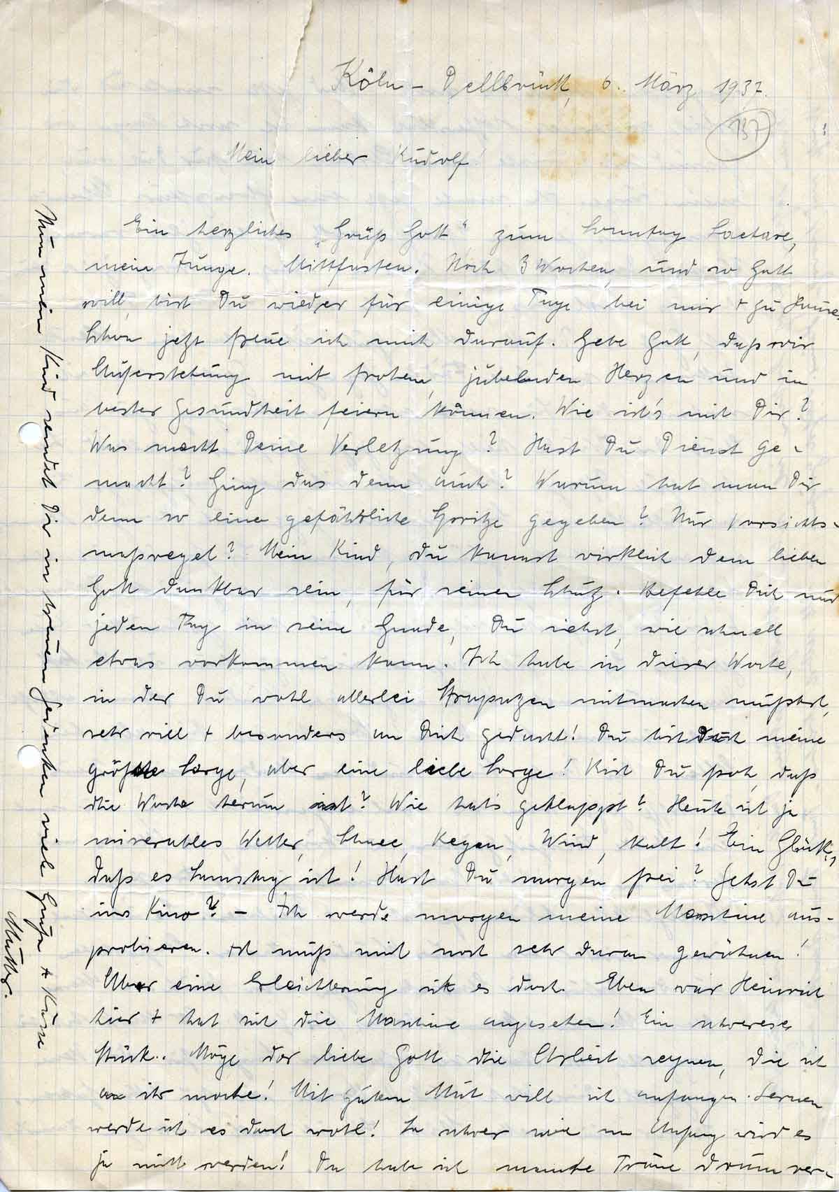 Ein herzliches „Grüß Gott“ zum Sonntag Laetare, mein Junge. Mittfasten. Noch 3 Wochen, und so Gott will, bist Du wieder für einige Tage bei mir + zu Hause. Schon jetzt freue ich mich darauf. Gebe Gott, daß wir Auferstehung mit frohem, jubelnden Herzen und in bester Gesundheit feiern können. Wie ist’s mit Dir? Was macht Deine Verletzung? Hast Du Dienst gemacht? Ging das denn auch? Warum hat man Dir denn so eine gefährliche Spritze gegeben? Nur Vorsichtsmaßregel? Mein Kind, Du kannst wirkliche dem lieben Gott dankbar sein, für seinen Schutz. Befehle Dich nur jeden Tag in seine Gnade, du siehst, wie schnell etwas vorkommen kann. Ich habe in dieser Woche, in der Du wohl allerlei Strapazen mitmachen mußtest, sehr viel + besonders an Dich gedacht! Du bist doch meine größte Sorge, aber eine leibe Sorge! Bist Du froh, daß die Woche herum ist? Wie hat’s geklappt? Heute ist ja miserables Wetter, Schnee, Regen, Wind, kalt! Ein Glück, daß es Samstag ist! Hast Du morgen frei? Gehst Du ins Kino? – Ich werde morgen meine Maschine ausprobieren. Ich muß mich noch sehr daran gewöhnen! Aber eine Erleichterung ist es doch. Eben war Heinrich hier + hat sich die Maschine angesehen! Ein schweres Stück. Möge der liebe Gott die Arbeit segnen, die ich an ihr mache! Mit gutem Mut will ich anfangen. Lernen werde ich es doch wohl! So schwer wie am Anfang wird es ja nicht werden! Ich habe manche Träne drum ver-