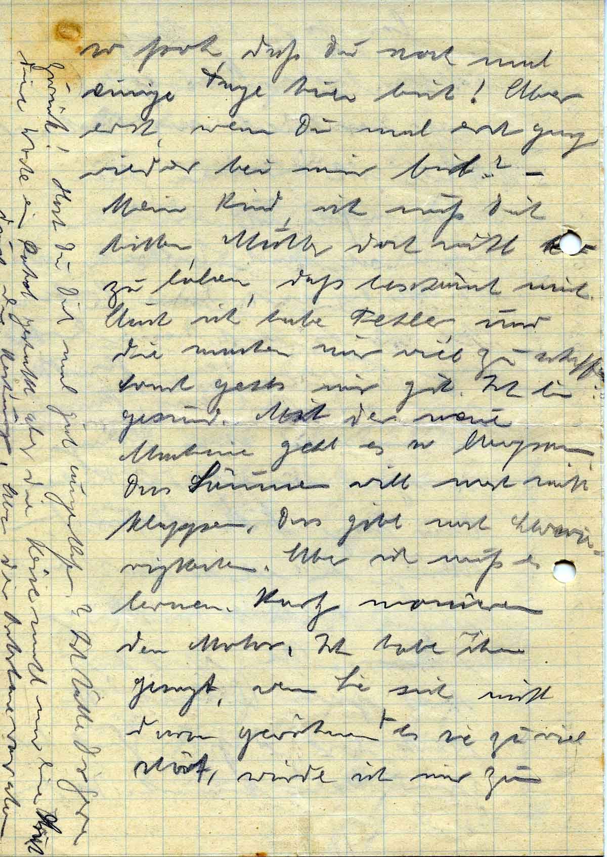 so froh, dass Du noch mal einige Tage hier bist! Aber erst, wenn Du mal erst ganz wieder bie mir bist?- Mein Kind, ich muß Dich bitten, Mutter doch nicht so zu loben, dass beschämt mich. Auch ich habe Fehler und die machen mir viel zu schaffen. Sonst geht’s mir gut. Ich bin gesund. Mit der neuen Maschine geht es so bequem. Das Säumen will noch nicht klappen. Das gibt noch Schwierigkeiten. Aber ich muß es lernen. Kurtz monieren den Motor. Ich habe ihm gesagt, wenn Sie sich nicht daran gewöhnen + es sie zu viel stört, würde ich mir zum