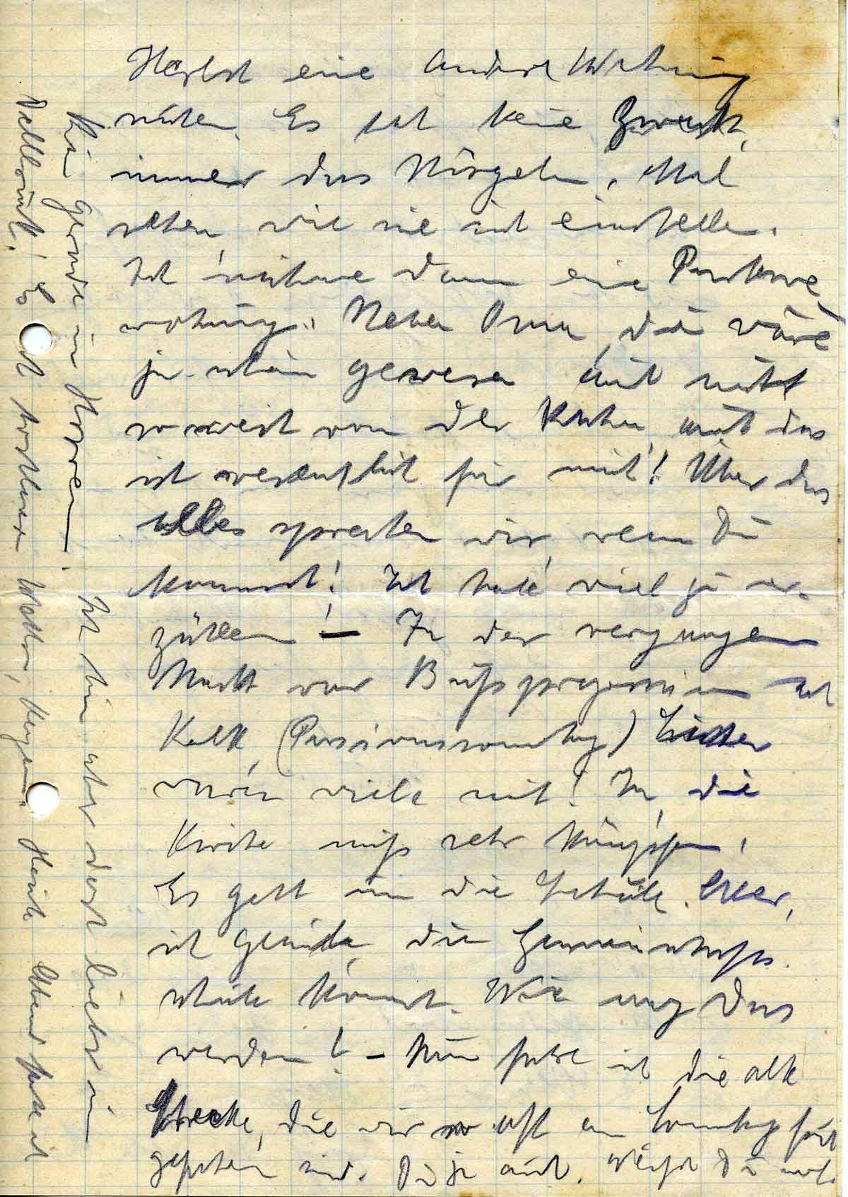 Herbst eine andere Wartung suchen. Es hat keinen Zweck, immer das Nörgeln. Mal sehen, wie sie sich einstellen. Ich nähme dann eine Parterrewohnung. Neben Oma, die wäre ja schön gewesen auch mit so … von der Ruhe, auch das ist wesentlich für mich! Über das alles sprechen wir, wenn Du kommst! Ich habe viel zu erzählen. – In der vergangenen Nacht war Bußprozession in Kalk, (Passionssonntag). Leider waren viele mit! In die Kirche muß sehr kämpfen. Es geht um die Geduld. Aber, ich glaube, die Gemeinschaftsschule kommt. Wie mag das werden? – Nun fahre ich die alte Strecke, die wir so oft am Sonntag früh gefahren sind. Du ja auch. Weißt Du noch.