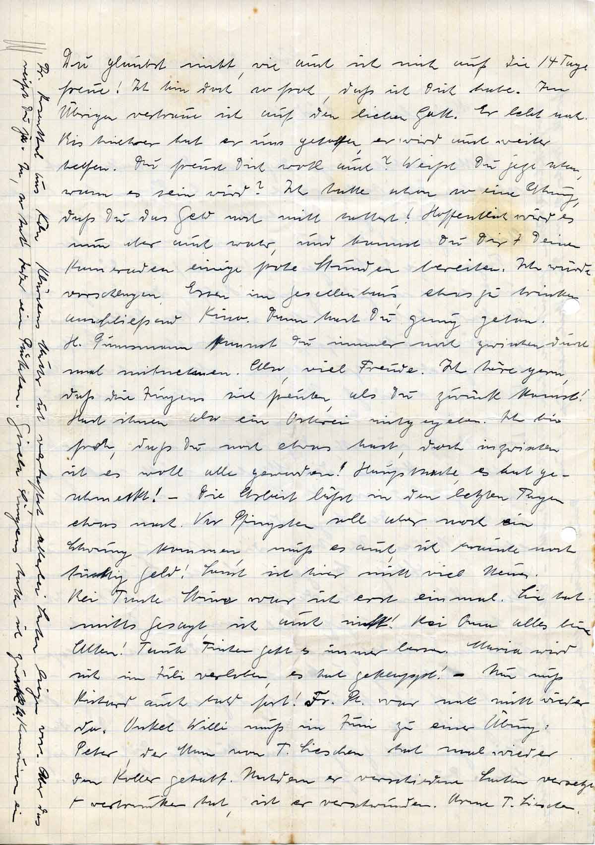 Du glaubst nicht, wie auch ich mich auf die 14 Tage freue! Ich bin doch so froh, dass ich Dich habe. Im übrigen vertraue ich auf den lieben Gott. Er lebt nah. Bis hierher hat er uns geholfen, er wird auch weiter helfen. Du freust Dich wohl auch? Weißt Du jetzt schon, wann es sein wird? Ich hatte schon so eine Ahnung, dass Du das Geld noch nicht hattest! Hoffentlich wird es nun aber auch wahr, und kannst Du Dir + Deinem Kameraden einige frohe Stunden bereiten. Ich würde vorschlagen, Essen im Gesellenhaus, etwas zu trinken anschließend Kino. Dann hast Du genug getan. H. Punsmann kannst Du immer mal zwischendurch mal mitnehmen. Also, viel Freude. Ich höre gern, daß die Jungen sich freuten, als Du zurück kamst! Hast ihnen also ein Osterei mitgegeben. Ich bin froh, dass Du noch etwas hast, doch inzwischen ist es wohl alle geworden! Hauptsache, es hat geschmeckt! – Die Arbeit läßt in den letzten Tagen etwas nach. Vor Pfingsten soll aber noch ein Schwung kommen, muß es auch, ich brauche noch tüchtig Geld! Sonst ist hier nicht viel Neues. Bei Tante Stina war ich erst einmal. Sie hat nichts gesagt, ich auch nicht! Bei Oma alles beim Alten! Tante Finchen geht es immer besser. Maria wird sich im Juli verloben, es hat geklappt! – Nun muß Richard auch bald fort! Fr. Pl. War auch nicht wieder da. Onkel Willi muß im Juni zu einer Übung. Peter, der Mann von T. Lieschen, hat mal wieder den Koller gehabt. Nachdem er verschiedene Sachen versetzt + vertrunken hat, ist er verschwunden.. Arme T. Lieschen.