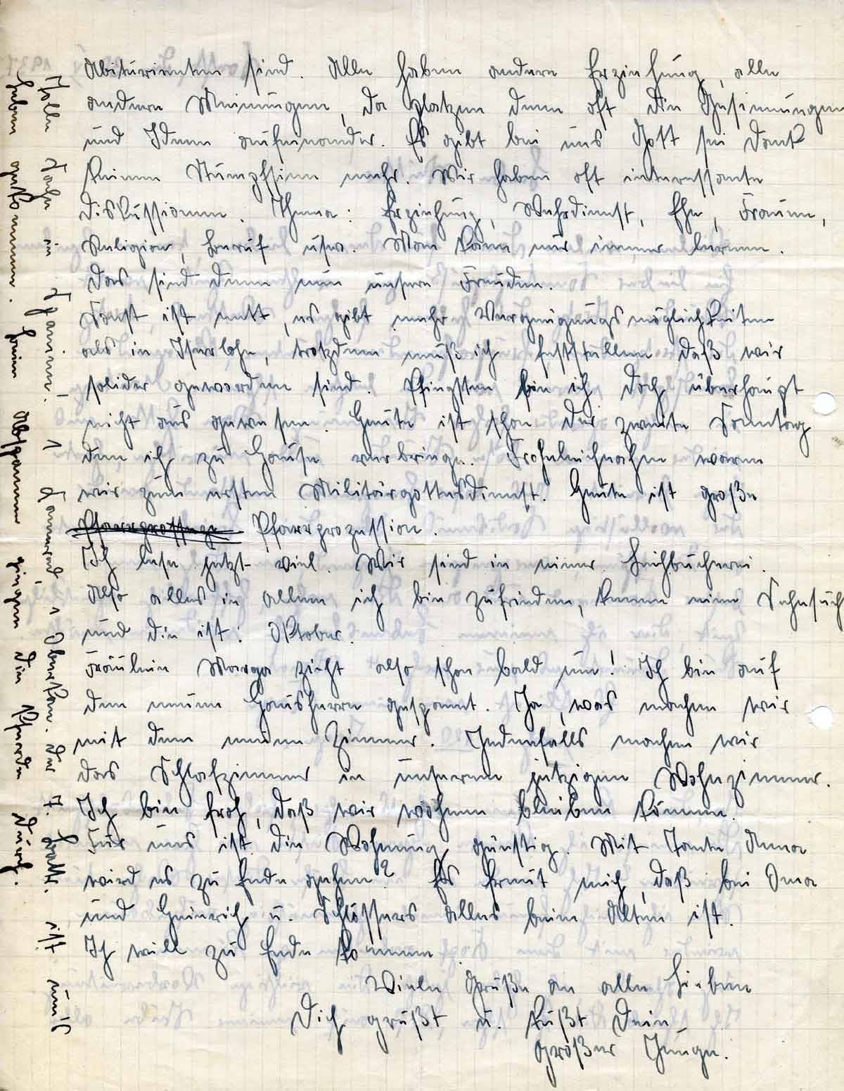 Vielen, vielen Dank für Deine lieben, treuen Zeilen. Ein lieber Sonntagsgruß zur Rechten Zeit wirkt Wunder. Trotz des hellen, frohen Wetters, trotz der strotzenden, fruchtahnenden, bunten, klingenden Landschaft waren wir die letzten schönen Maitage in nicht gerade froher Stimmung. Man hatte uns wieder einmal böse Stunden und mürrische, harte Tage bereitet. Aus böser Langeweile entstand wieder der wollüstige Sadismuis. Aber Dein Brief erinnerte an die schöne, vergangene Jugend, an Dich, mein bester Kamerad und an die nahe, hoffentlich glückliche Zeit, die ich meinem Lebensberuf widmen möchte. Nun dauert es nur noch 4 Monate.