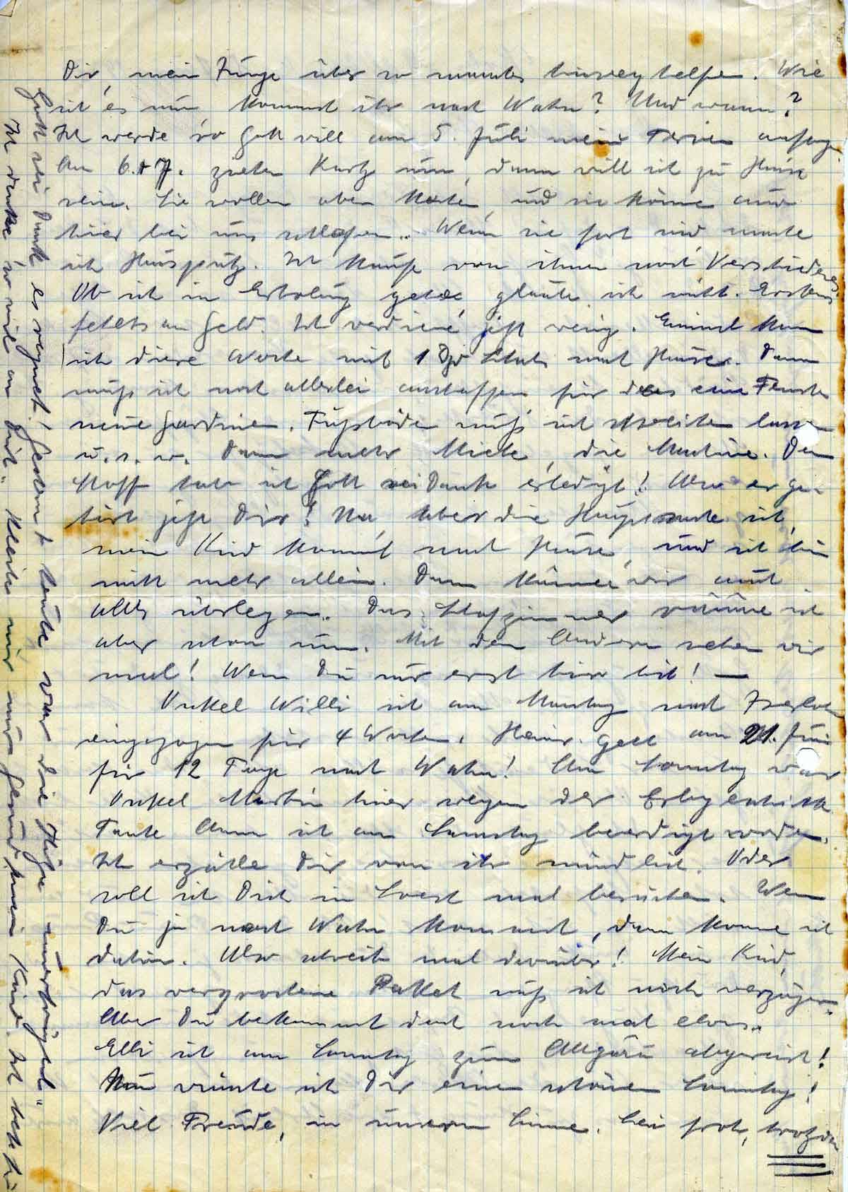 Dir, mein Junge über so manches hinweghelfen. Wie ist es nun, kommt Ihr nach Wahn? Und wann? Ich werde so Gott will am 5. Juli meine Ferien anfangen. Am 6. + 7. ziehen Kurtz um, dann will ich zu Hause sein. Sie wollen aber …… und sie können auch hier bei uns schlafen. Wenn sie fort sind, mache ich Hausputz. Ich kaufe von ihnen noch Verschiedenes. Ob ich in Erholung gehe, glaube ich nicht. Erstens fehlts am Geld,. Ich verdiene jetzt wenig. Einmal kam ich diese Woche mit 1 Dzd Schals nach Hause. Dann muß ich noch allerlei anschaffen, für das eine Fenster neue Gardinen, Fußleisten muß ich streichen lassen u.s.w. Dann mehr Miete, die Maschine. Den Stoff habe ich Gott sei Dank erledigt! Aber er gehört jetzt Dir! Na, aber die Hauptsache ist, mein Kind kommt nach Hause, und ich bin nicht mehr allein. Dann können wir auch alles überlegen. Das Schlafzimmer räume ich aber schon um. Mit den Andern sehen wir mal! Wenn Du nur erst einmal hier bist! –