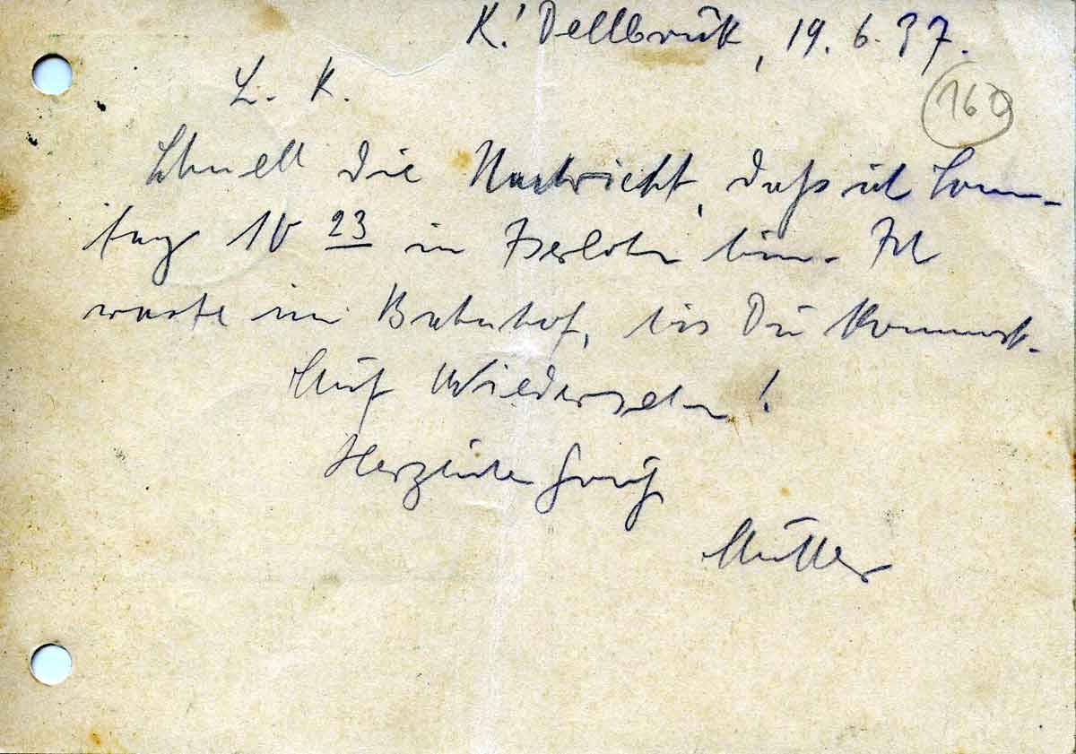 Anna Schmitz an Sohn Rudolf, 19. Juni 1937 K.’Dellbrück, 19. 6. 37. L. R. Schnell die Nachricht, dass ich Sonntag 1023 in Iserlohn bin. Ich warte im Bahnhof, bis Du kommst. Auf Wiedersehn! Herzlichen Gruß Mutter